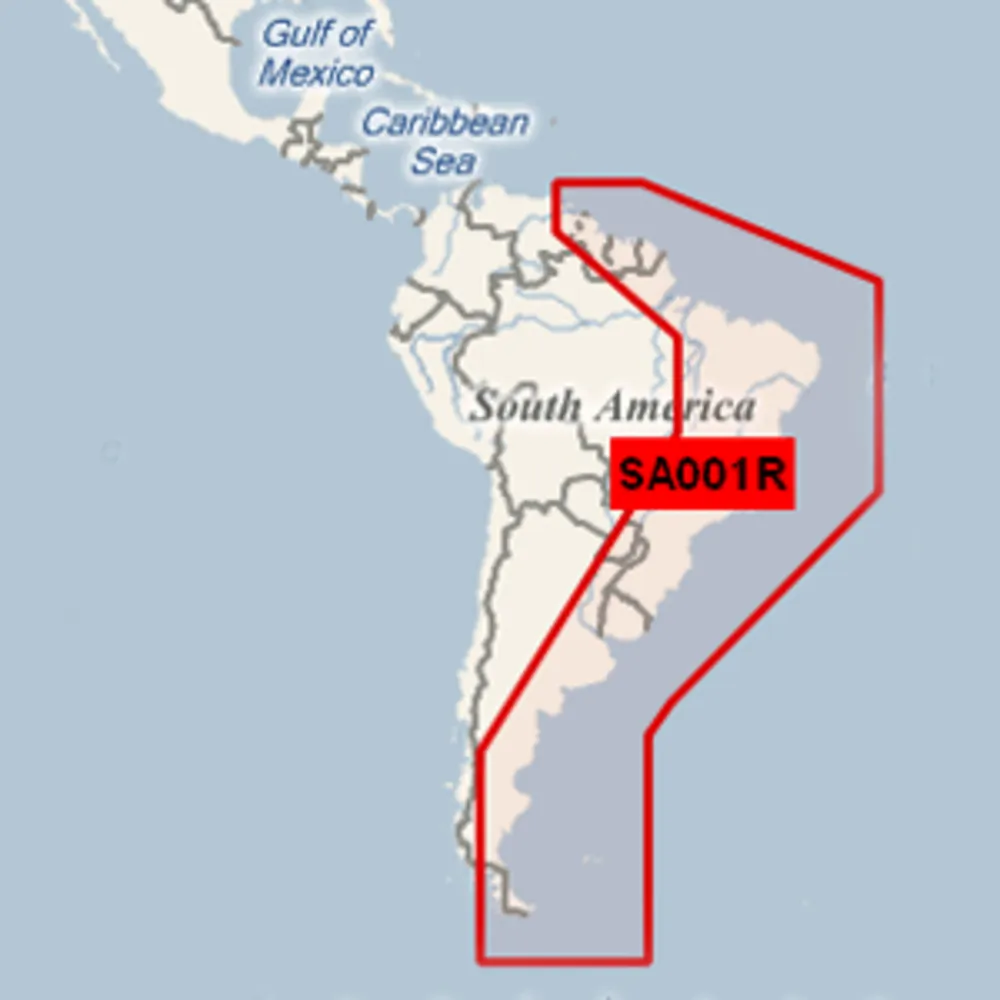 Coverage of the east coast of South America from the Golfo de Paria to Tierra del Fuego. Coverage includes Trinidad and Tobago; the Lago de Brasilia; the Rio de la Plata; the Rio Uruguay to Salto, Uruguay; the Rio Parana to Parana, Argentina and the Falkland Islands (Islas Malvinas).
