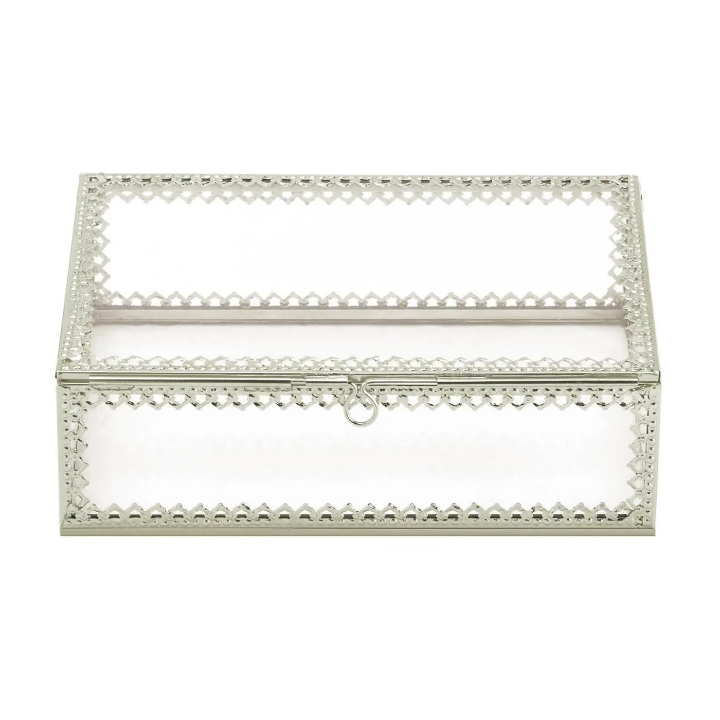 This exquisite glass jewelry box features a sleek silver frame, perfect for storing and showcasing your favorite jewelry pieces. The clear glass design allows you to view your items at a glance while keeping them dust-free. It’s not only a practical storage solution but also a beautiful decorative piece for any vanity or dresser.