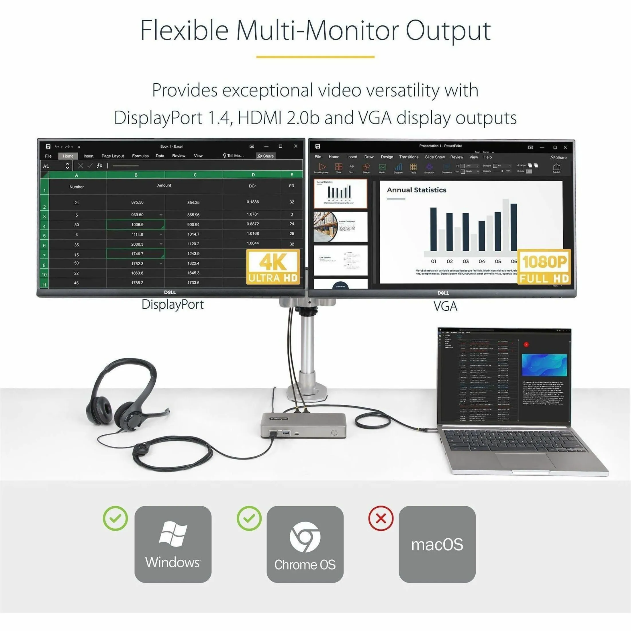 DUAL-MONITOR USB-C DOCKING STATION, DISPLAYPORT & HDMI OR VGA, MULTI MONITOR DOC