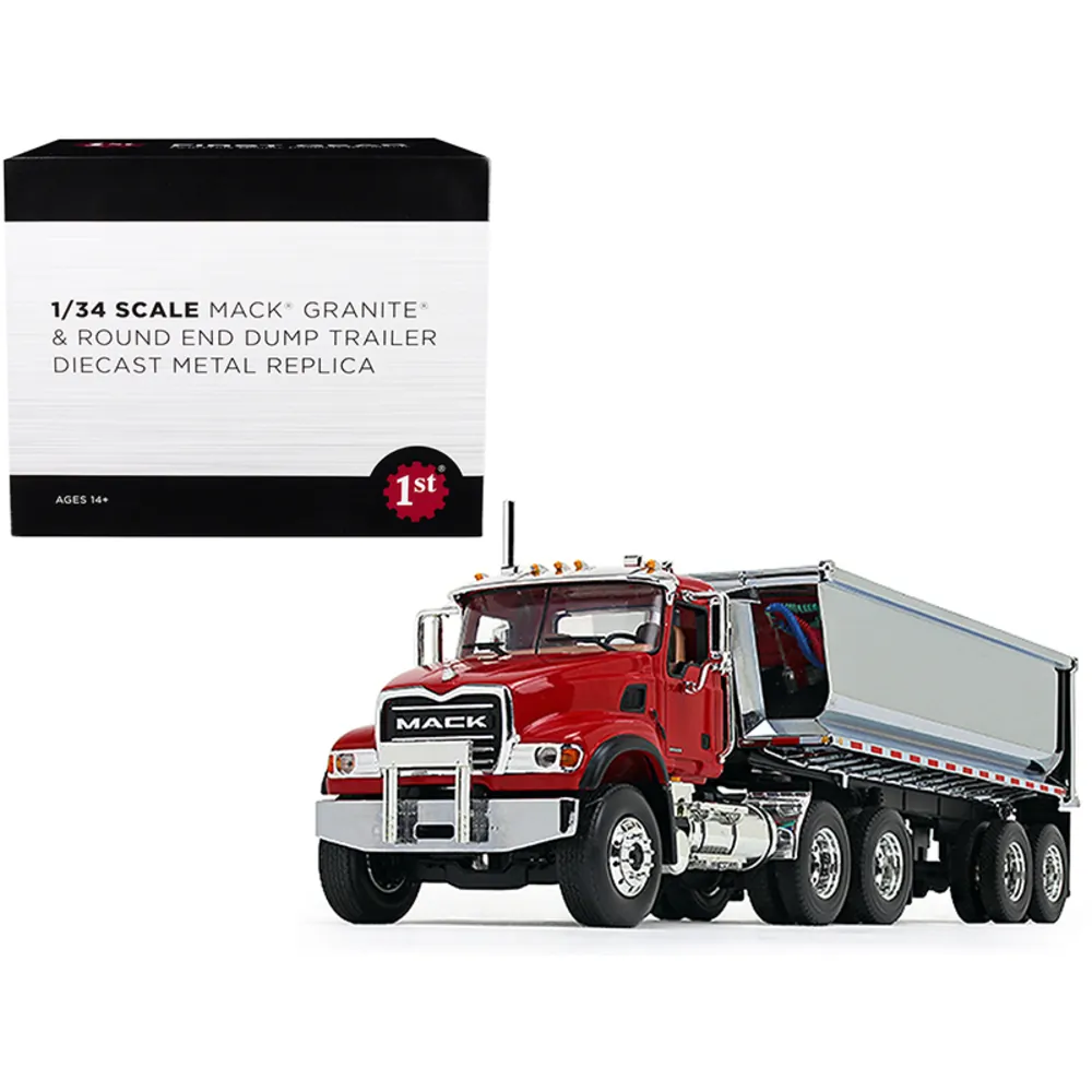 Experience the elegance and power of the Mack Granite with this stunning 1/34 scale diecast model. This model features a vibrant red and chrome finish, combining intricate details with durable construction. The model includes a detachable round end dump trailer and is designed for both collectors and enthusiasts.