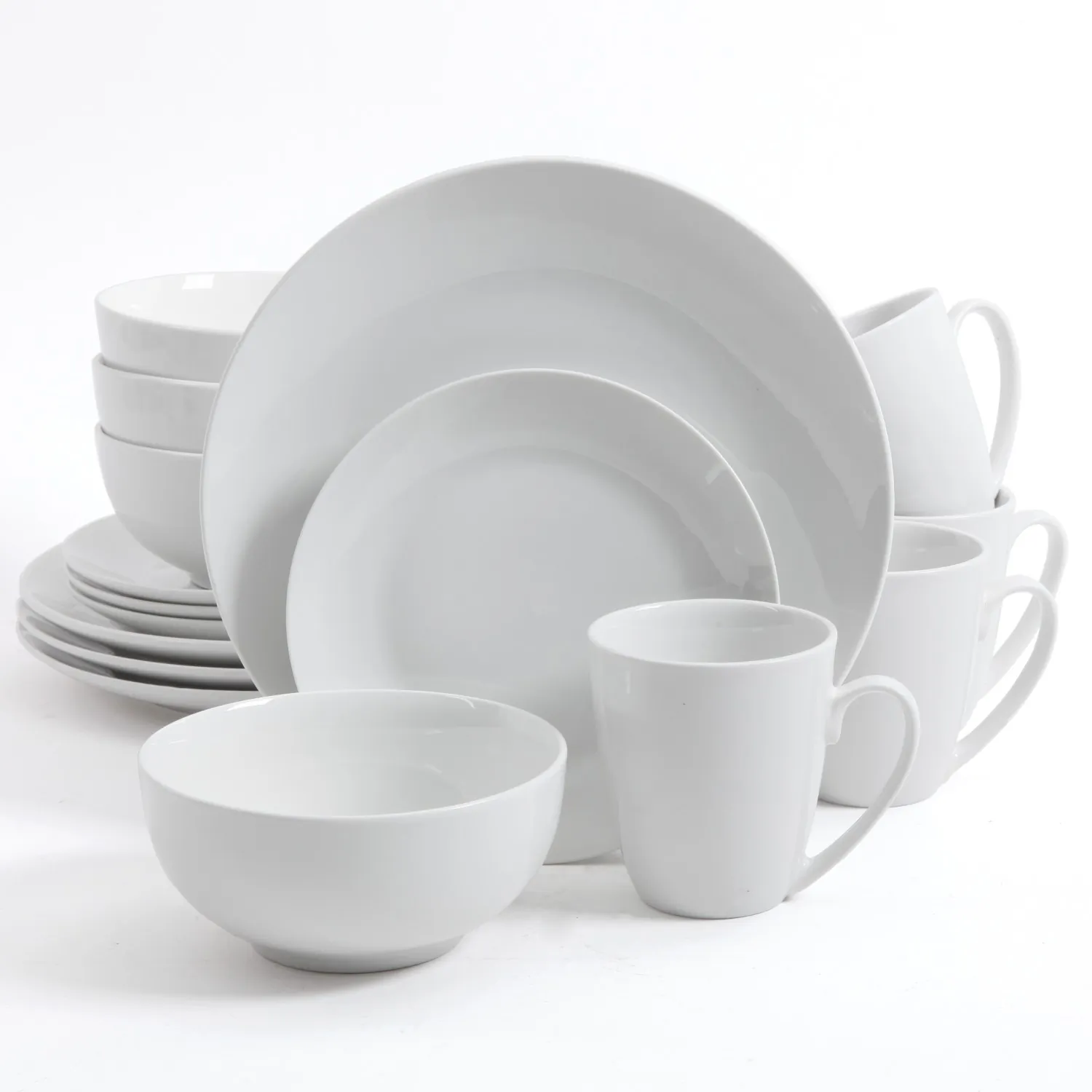This elegant Gibson Home Ogalla 16-Piece Porcelain set includes service for four, with four 10.25 inch dinner plates, four 7.25 inch salad plates , four 6 inch bowls and four 12.5 ounce mugs.
