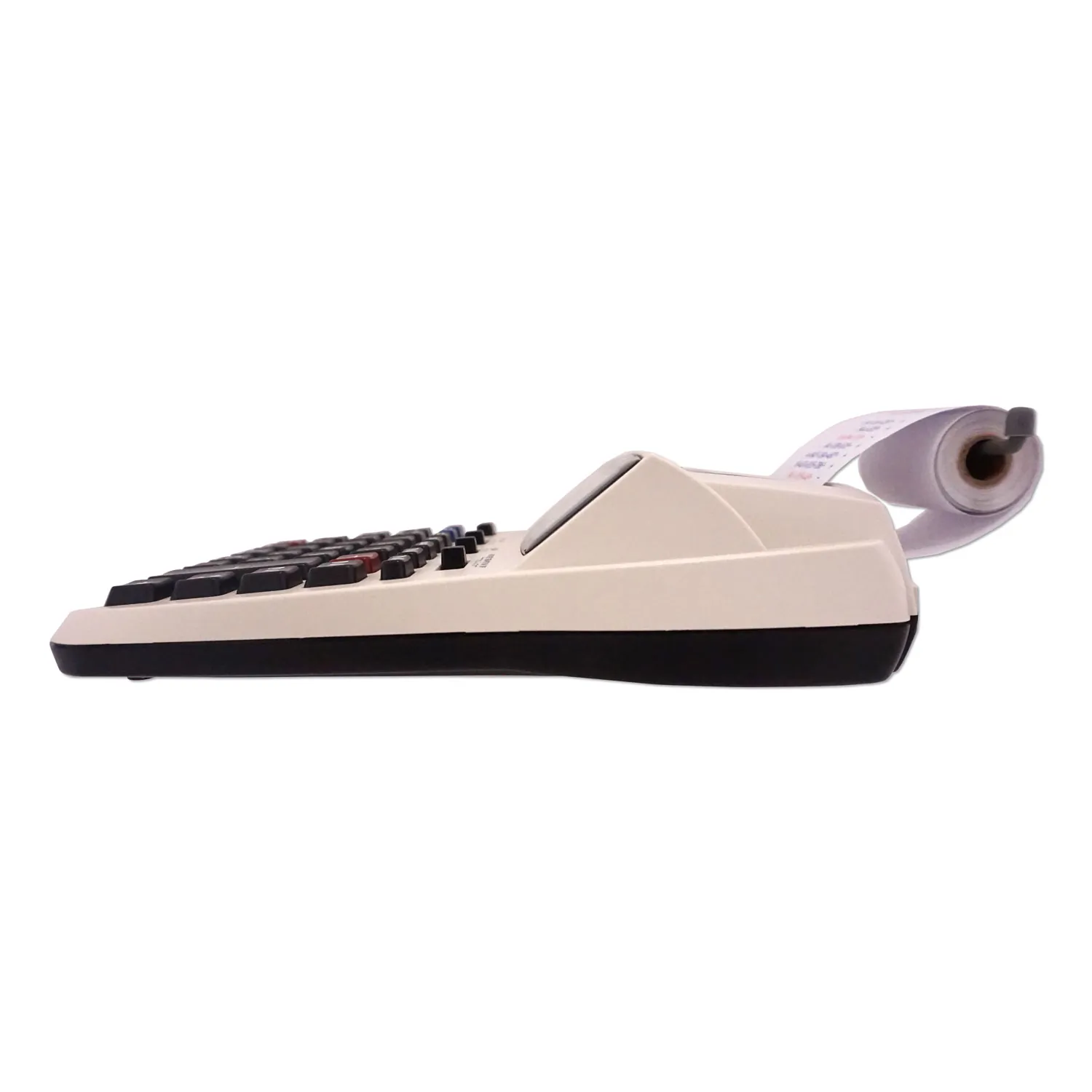 Compact two-color printing calculator features an extra-large, 12-digit liquid crystal display (LCD) and useful functions. Print 2.3 lines per second in two colors (black and red). Enter two cost/sell/margin variables, and the third appears and prints. Calculator displays and prints current time or date. The time or date can be displayed and printed by depressing the time key. Functions include tax +/- keys, four-key memory, change sign, percent and date/nonadd keys, item count, percent key and automatic constants. Calculator operates on AC/DC with the included AC adapter. Four AA batteries are sold separately.