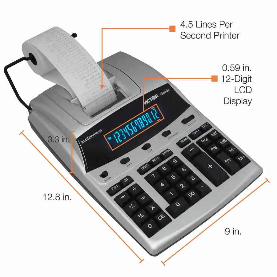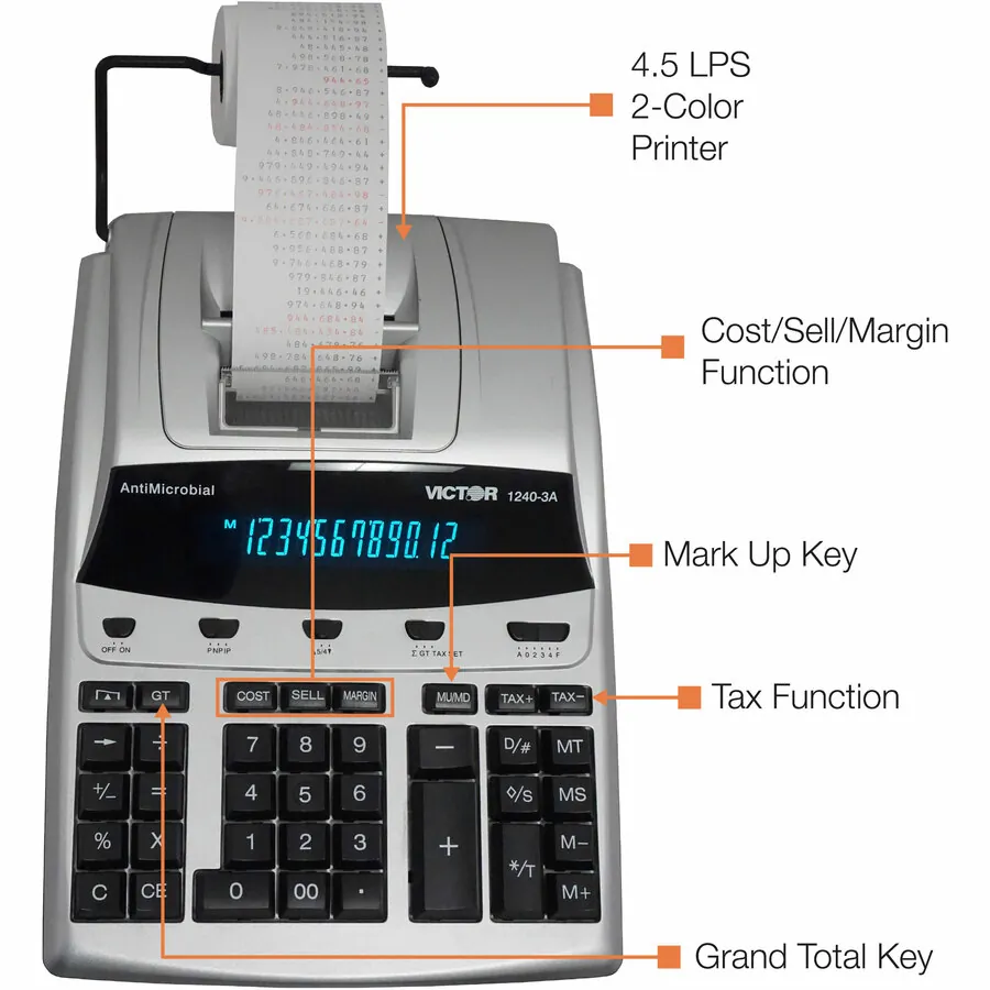 12-digit professional desktop calculator prints 4.5 lines per second in two colors. Design features a 12-digit fluorescent display and commercial keyboard. Functions include automatic tax keys, markup/gross profit margin, four-key independent memory, delta percent-percent of change, percent, change sign, grand total, item count, date/nonadd, and sigma. Calculator runs on AC power and is made with a high percentage of recycled material.
