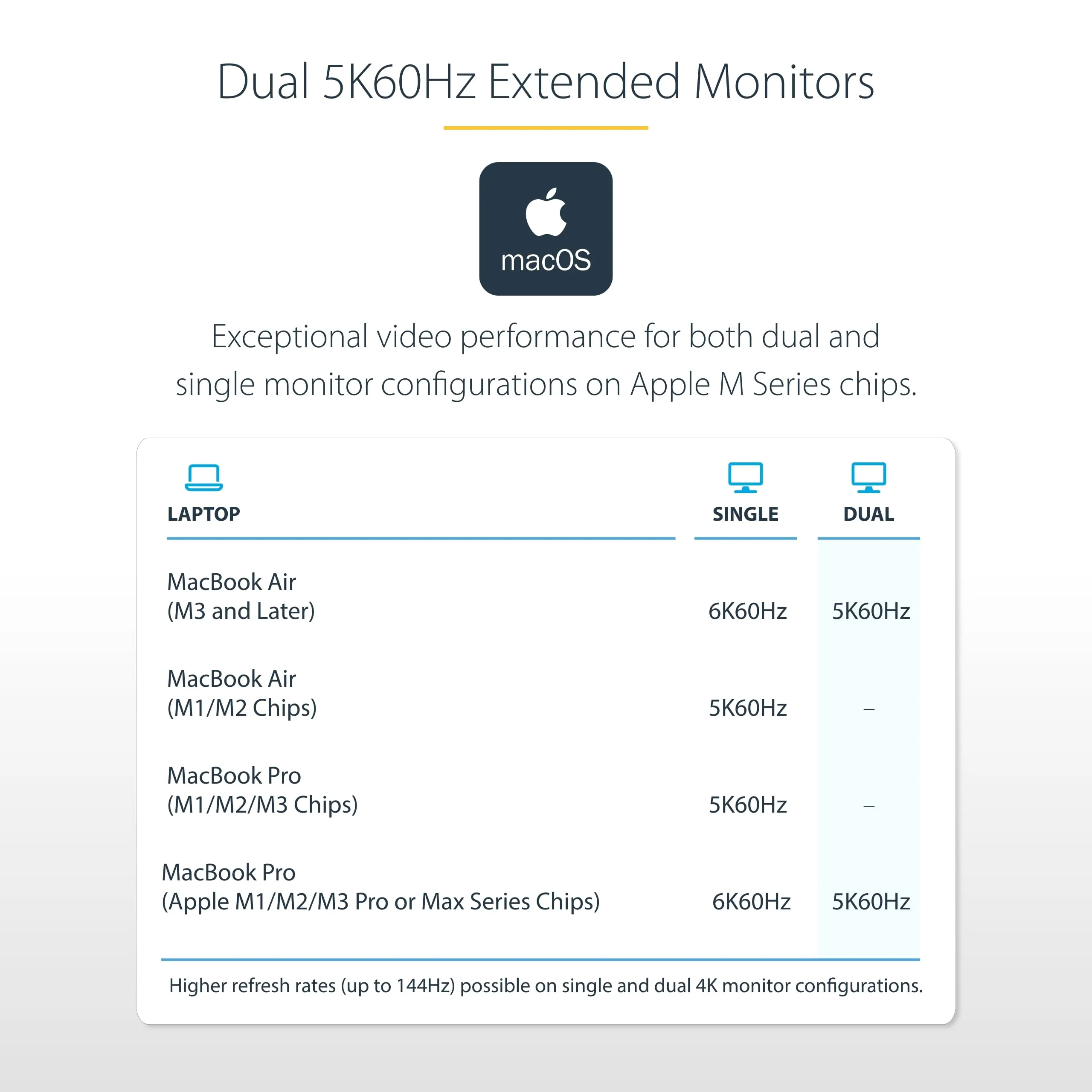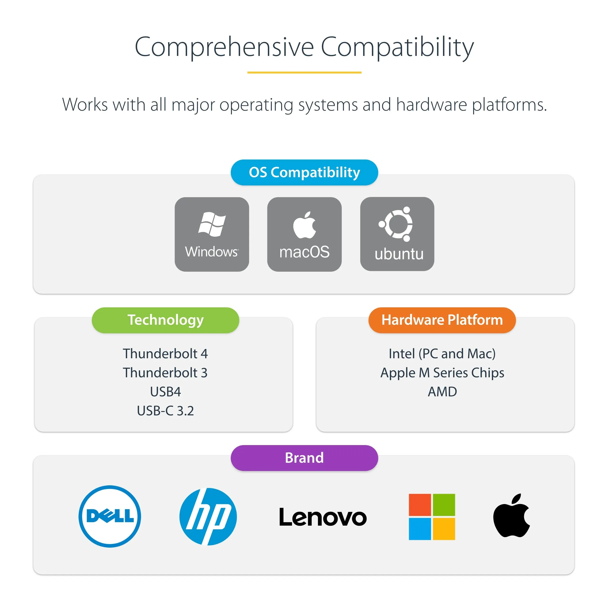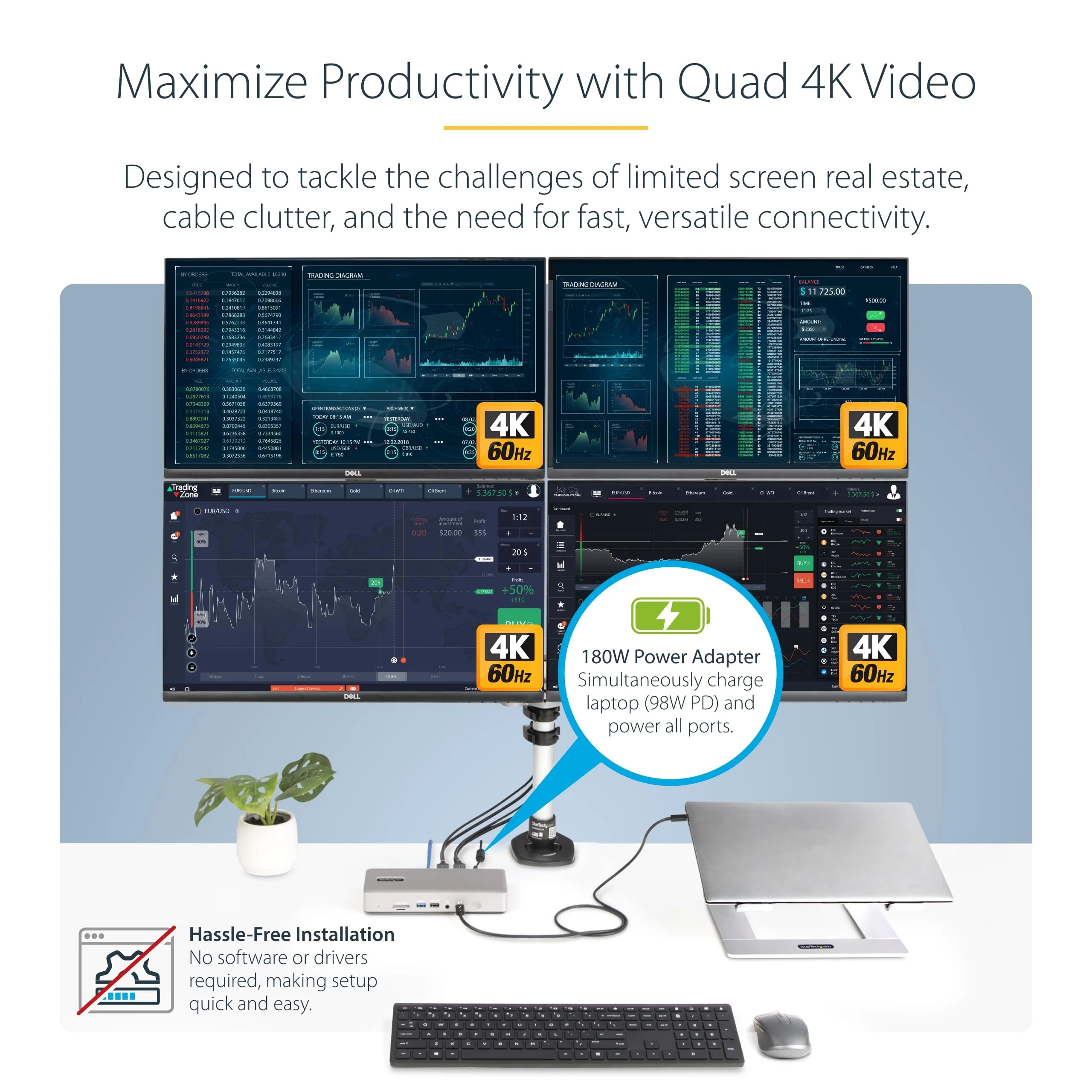 Thunderbolt 4 Certified docking station; Driverless setup; Works with all TB 3/4 laptops - 2x HDMI and 2x DisplayPort supports up to quad 4K 60Hz w/Intel 12th Gen CPU supporting DP 1.4 w/DSC; Quad displays at lower resolutions or refresh-rates without DSC or with earlier Intel revisions; Single display up to 8K 60Hz - Extended dual monitors on Apple M1/M2/M3 Max/Pro MacBooks; Single Display on Apple M1/M2/M3 MacBooks/iPad Pro M1 and later - 98W PD; 7-Port USB Hub; 2.5GbE - TB4 host Cable included