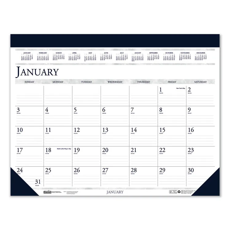 This recycled desk pad calendar is perfect for organizing your month. Measuring 22 x 17 inches, it features a two-color design that enhances your workspace while being eco-friendly.