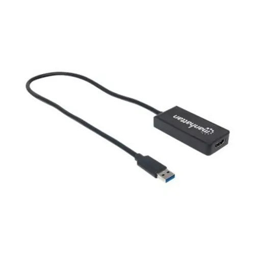 The Manhattan SuperSpeed USB 3.0 to HDMI Adapter transmits PC audio/video signals to HDMI projectors, flat-panel displays, televisions and other similar devices. Built-in circuitry allows digital media enthusiasts to easily enjoy PC-based multimedia content on HD displays and TVs while maintaining simultaneous A/V reception at the source PC. Its HD capability supports up to 2560 x 1440 and 1080p to serve a wide range of resolutions in many PC and HD applications including training, retail and trade show settings. Windows and Mac compatibility makes it easy to set up. It effortlessly delivers digital content that's stored on desktop and notebook computers to other devices with HDMI input capabilities.