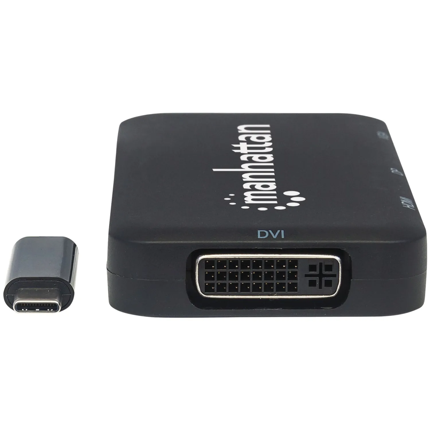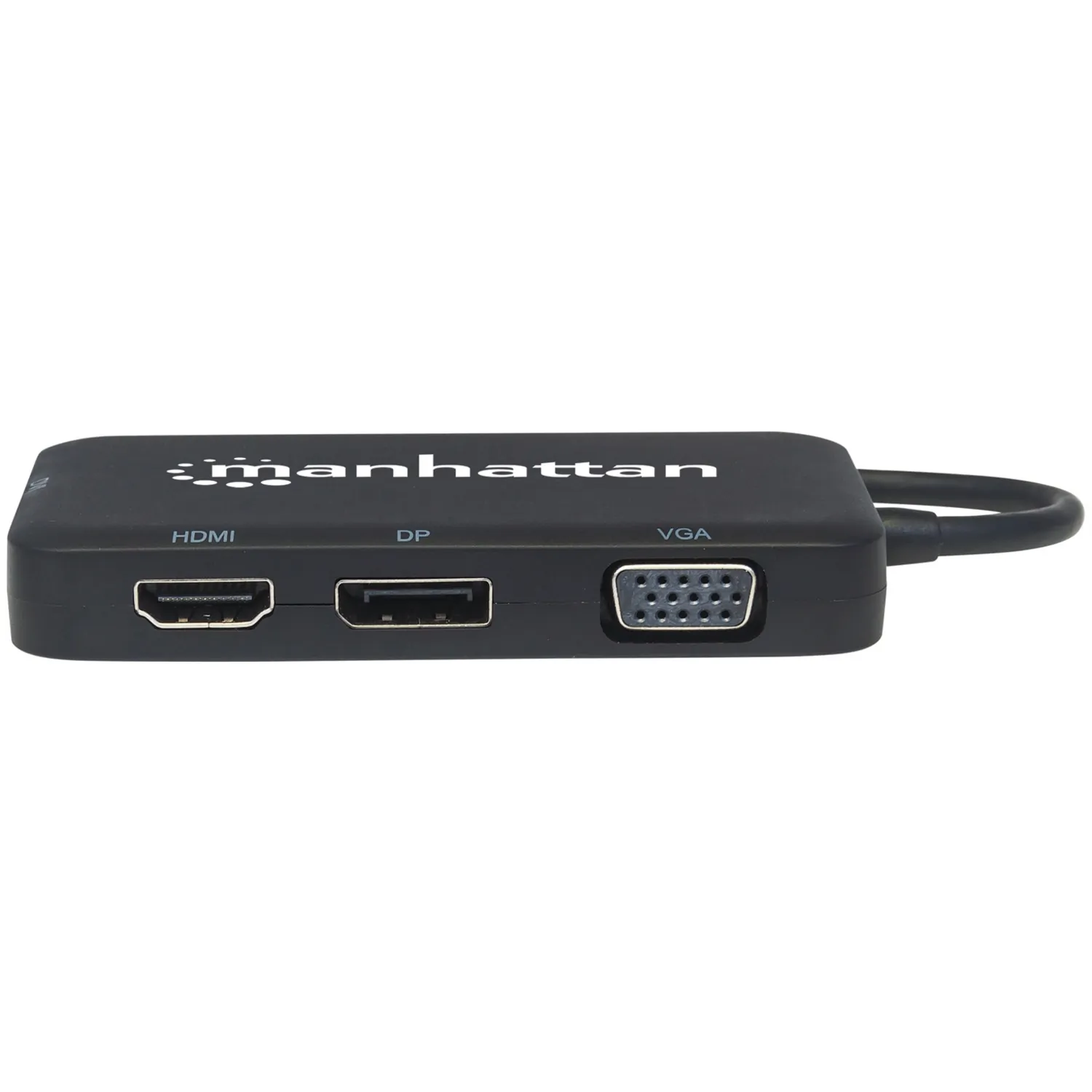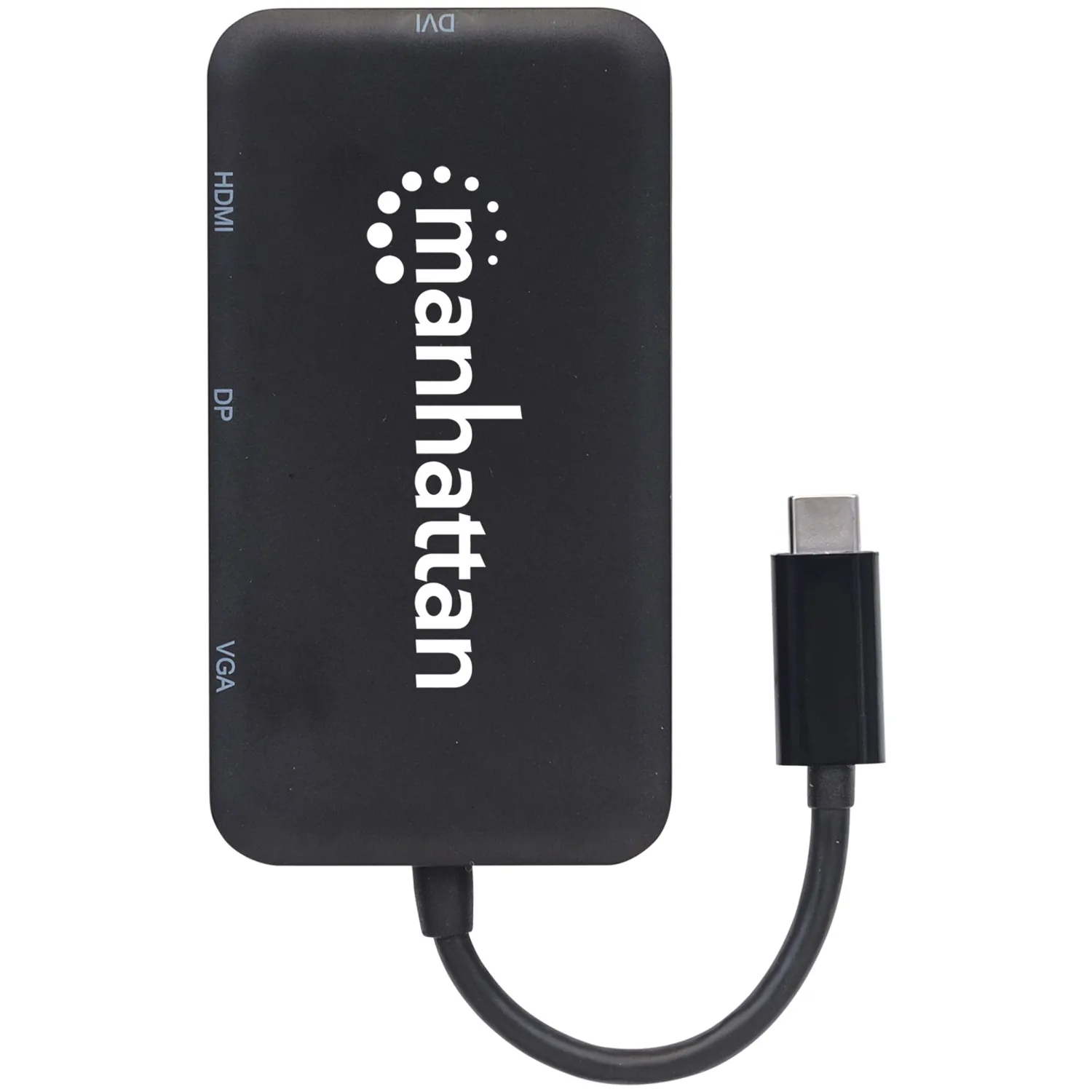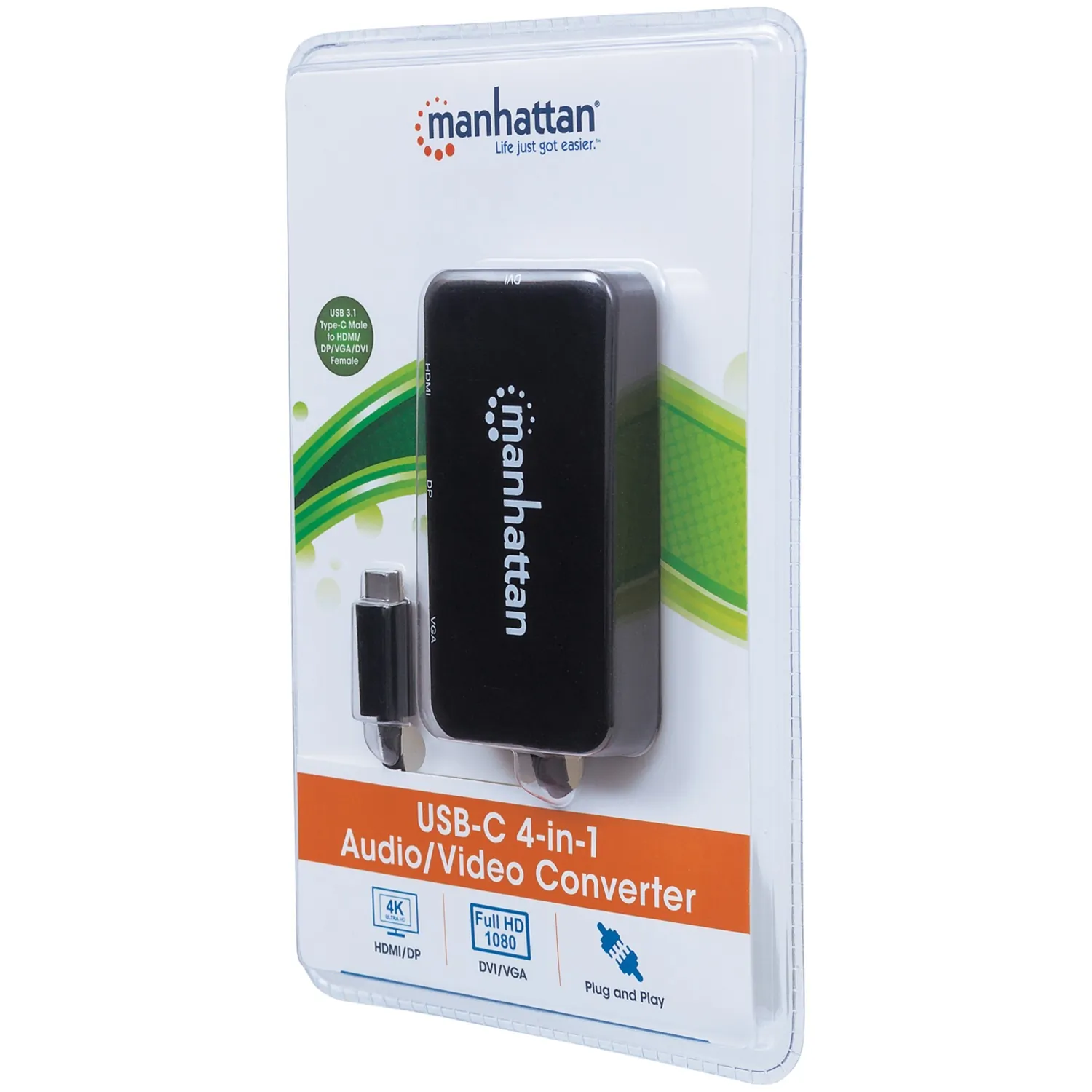 The Manhattan USB-C 4-in-1 Audio/Video Converter establishes a fast, simple and convenient link between newer USB Type-C equipped media sources (computers, tablets, Smartphones, etc.) and existing HDMI, DisplayPort, VGA or DVI displays (monitors, projectors, etc.). The Manhattan USB-C 4-in-1 Audio/Video Converter is easy and quick to install-no complicated configuration or setup required. Its all-in-one design achieves a compact, integrated solution that eliminates unnecessary cables, tangles and clutter to keep installations and workspaces neat and orderly. Extend the service life of your equipment, and fully realize the investment and value of your HDMI, DP, VGA or DVI displays, projectors and peripherals with a Manhattan USB-C 4-in-1 Audio/Video Converter.