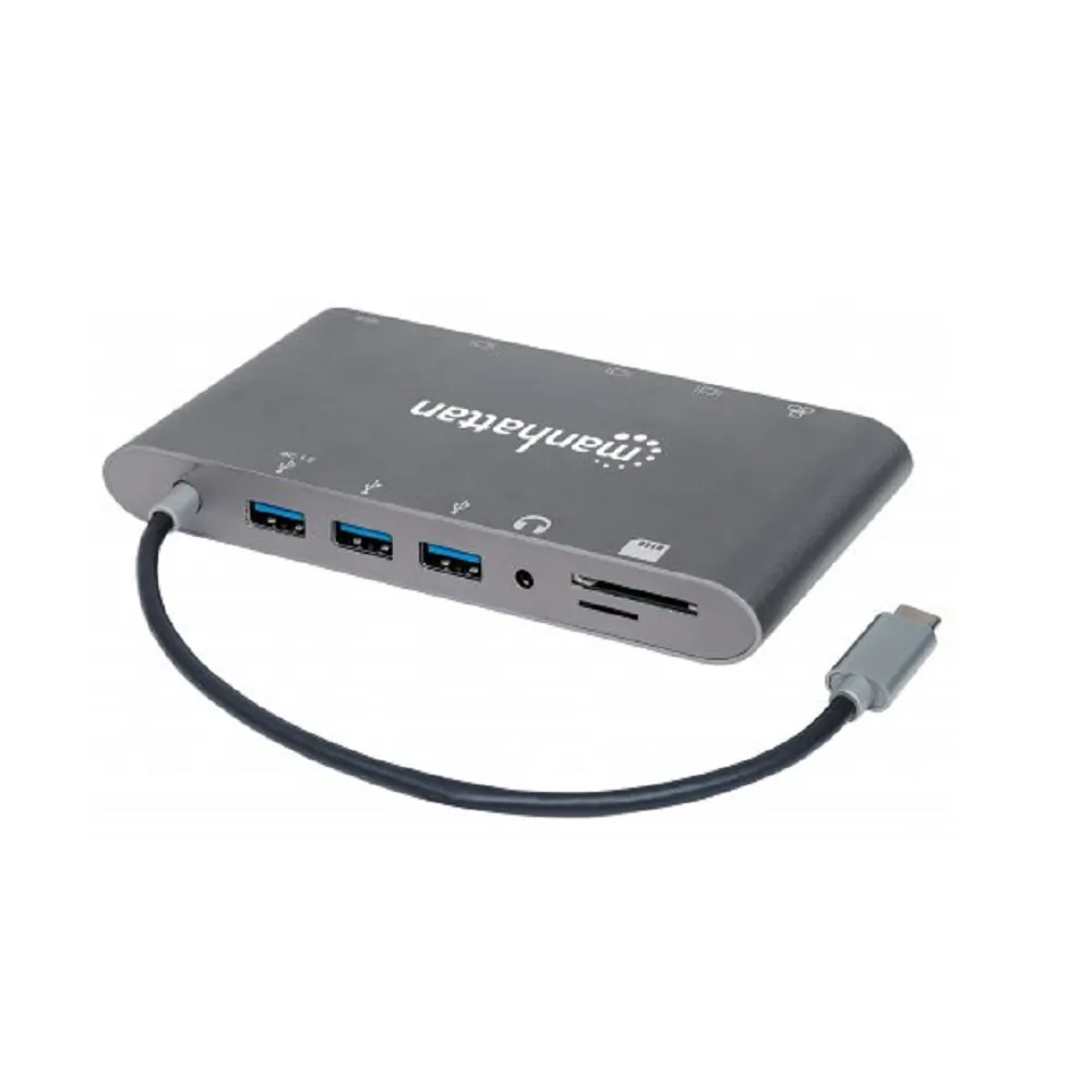 Multi-function docking station connects a USB Type-C device to an HDMI, Mini DP or VGA display, three USB 3.0 Type-A ports, a 10/100/1000 Mbps port, a 3.5 mm stereo port, a USB-C power port and an SD Card ReaderDelivers Ultra-High-Definition (UHD) 4K@30Hz video and audio over HDMI or Mini DP connection or HD 1080p video over VGA connectionMirror or extended-display modes support video resolutions up to 1080p@60Hz or 3840x2160 at 30 Hz (4K) Full UHD; Mac only supports mirror modeOne Gigabit Ethernet (10/100/1000) port for faster downloads, media streaming and gamingThree USB 3.0 Type-A ports to connect mice, keyboards or portable memory devices (and more) or to charge and sync a portable electronic deviceUSB-A SuperSpeed ports offer 5 Gbps data transmission speeds; BC1.2 port charges up to 7.5 W (5 V / 1.5 A)Easy access to media and content management with read/write/copy Micro SD and SD slots; supports automatic card detection and data transfer speeds up to 90 MbpsUSB-C Power Delivery (PD) port for a maximum of 60 W (20 V at 3 A) to connected devicesUSB-C port provides 5 Gbps data transmission3.5 mm jack for high-quality stereo sound; both mic (audio input) and headphone (audio output)Aluminum housing makes this durable converter the perfect desktop or travel companionCompatible with all USB-C DP-Alt-Mode-supported desktops, notebooks and tablets including Apple MacBook, Chromebook, Pixel and moreCompliant with DisplayPort 1.2 Alternate Mode (DP Alt Mode)Plug and PlayFully shielded to reduce EMI and other interference sourcesMolded PVC boot and strain reliefStandards and Certifications USB 3.1 HDMI HDCP 1.4 CE FCC RoHS2 WEEE General Video Resolutions: 640 x 480, 800 x 600, 1024 x 768, 1920 x 1200, 1080p, 3840 x 2160p at 30 Hz, 4K USB-A ports: 5 Gbps Supported flash cards: SD / SDHC / SDXC / EXTREME SD / EXTREME II SD / EXTREME III SD / ULTRA SD / ULTRA II SD / ULTRA II SD P PLUS / SD-ULTRA-X / ULTRA SPEED SD / SD PRO / SD ELITE PRO / HS SD / MMC / MMC 4.0 / HS MMC / HS RS MMC / RS MMC / RS MMC 4.0 / MMC Mobile Supported flash cards: SD, SDHC and SDXC; up to 128 GB Transfer speed: up to 90 Mbps 24-AWG cable gauge Bus powered USB-C PD Charging Port: 60 W (20 V at 3 A) USB-A Charging: 10 W (5 V at 2 A) One BC 1.2 port: 7.5 W (5 V at 1.5 A) Two ports share: 5 W (5 V at 1 A) Mylar and aluminum shielding Withstanding voltage: 300 VDC Insulation resistance: 10 M? Conductive resistance: 5 ?Connections Input: One USB Type-C 24-pin, male Outputs: One HDMI 19-pin, female One Mini DisplayPort 20-pin female One VGA 15-pin female One 10/100/1000 Mbps RJ45, female Three USB Type-A 4-pin, female One SD memory slot One Micro SD memory slot One 3.5mm Stereo, female One USB-C 24-pin, Power Delivery, femalePhysical Housing: 137 X 75 x 17 mm (5.4 x 3 x 0.7 in.) Cable Length: 20 cm (8 in.) Weight: 198 g (7 oz.) Housing: AluminumOperating Environment Operation Temperature: 0 ? 45°C (32 ? 113°F) Storage Temperature: -10 ? 70°C (14 ? 158°F) Humidity (noncondensing): 10 ? 90%System Requirements Windows XP/Vista/7/8.1/10 or Linux or Mac 10.7.1 or above Package Contents SuperSpeed USB-C to 7-in-1 Docking Station Quick Instruction Guide
