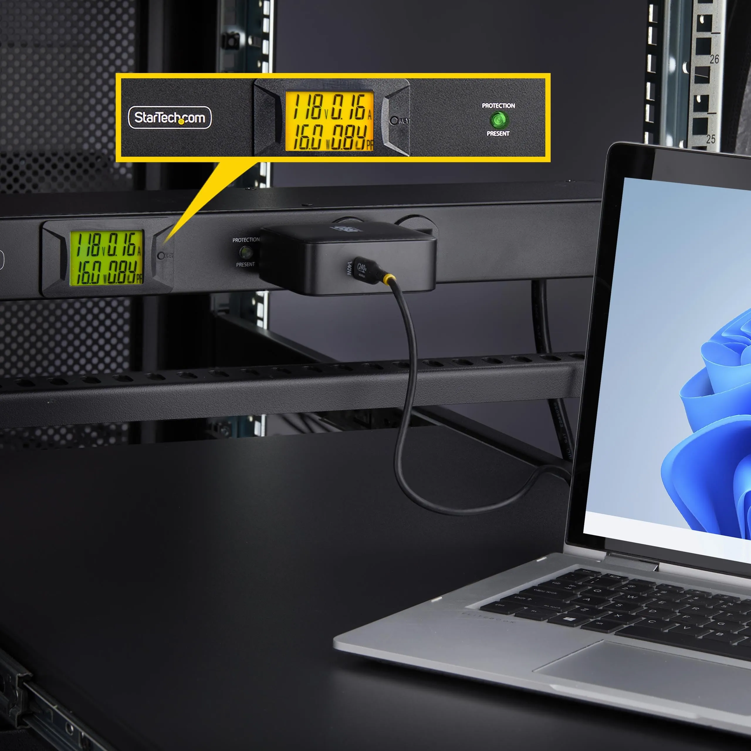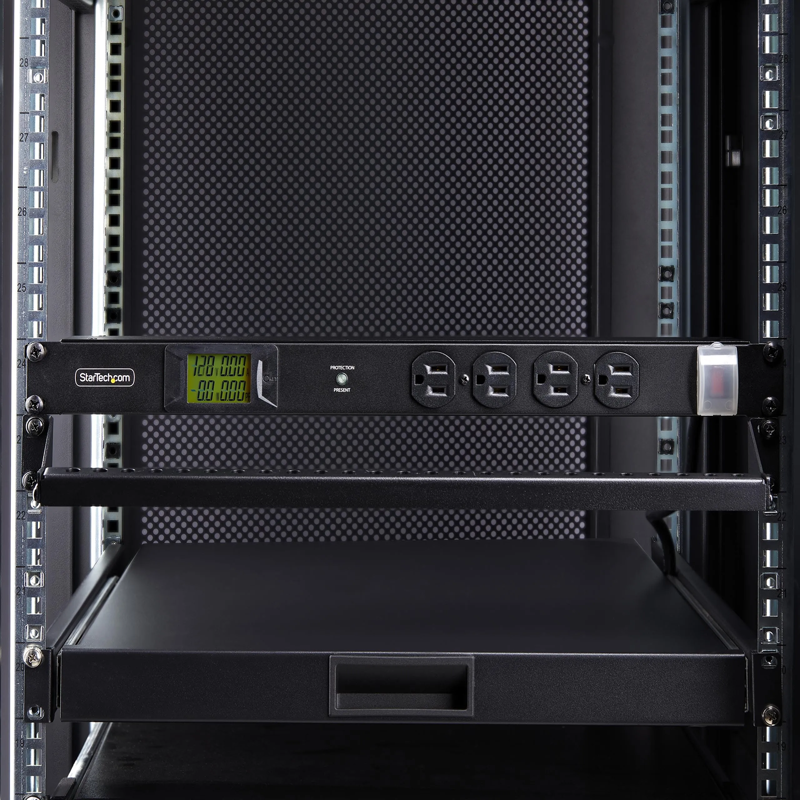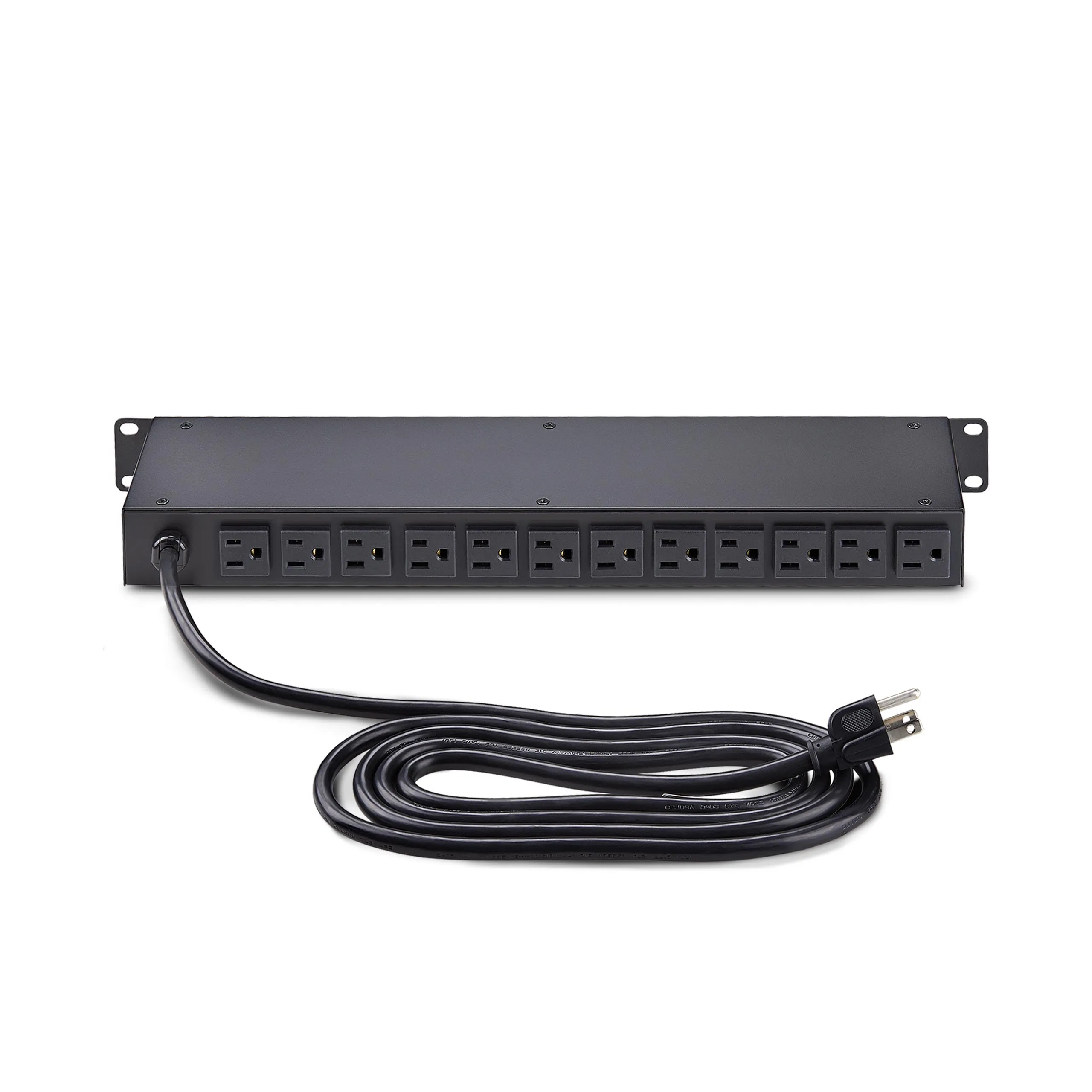 1U rack mount metered PDU w/ 16x NEMA 5-15R power outlets - 125V max/15A circuit breaker; Built-in 8ft NEMA 5-15P power cable - Power strip for server rooms/data centers - Backlit LCD for real-time monitoring of (V)/amps (A)/wattage (W)/power factor (PF) - Self-tripped MOV surge protector w/ mechanical-response; Resettable 15A circuit breaker; Safety cover prevents accidental resets - 1U horizontal rackmount power distribution unit is made of cold-rolled steel w/ textured finish for durability.