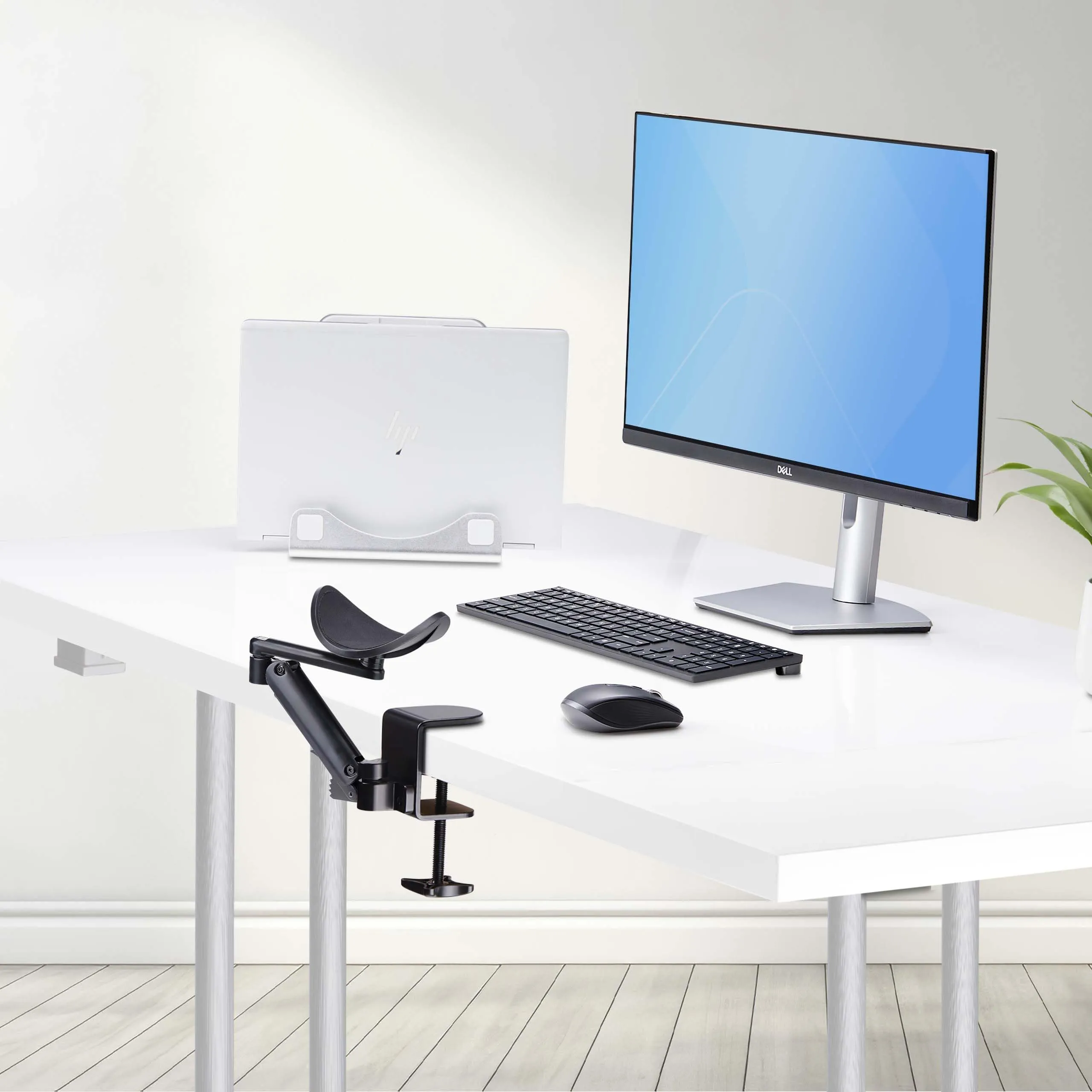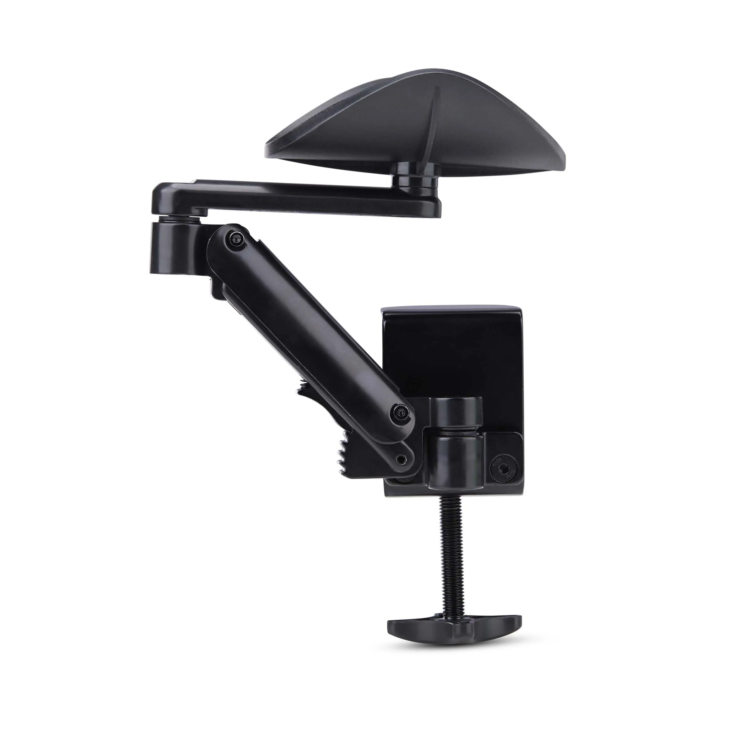 Enhance comfort and posture by reducing stress on the shoulder/arm/wrist while using a laptop/desktop; Ergonomic design supports swivel motion for typing/scrolling - 6 levels of height adjustment from -0.2in (-5mm) to 2.7in (70mm); Full 360-deg of motion - Solid die-cast aluminum; smooth foam padding on arm pad - Ships fully assembled/ready to install; Tool-less clamp-on installation with no drilling required/no damage to desk; Fits desk thicknesses up to 2in (52mm) - 2-year warranty.