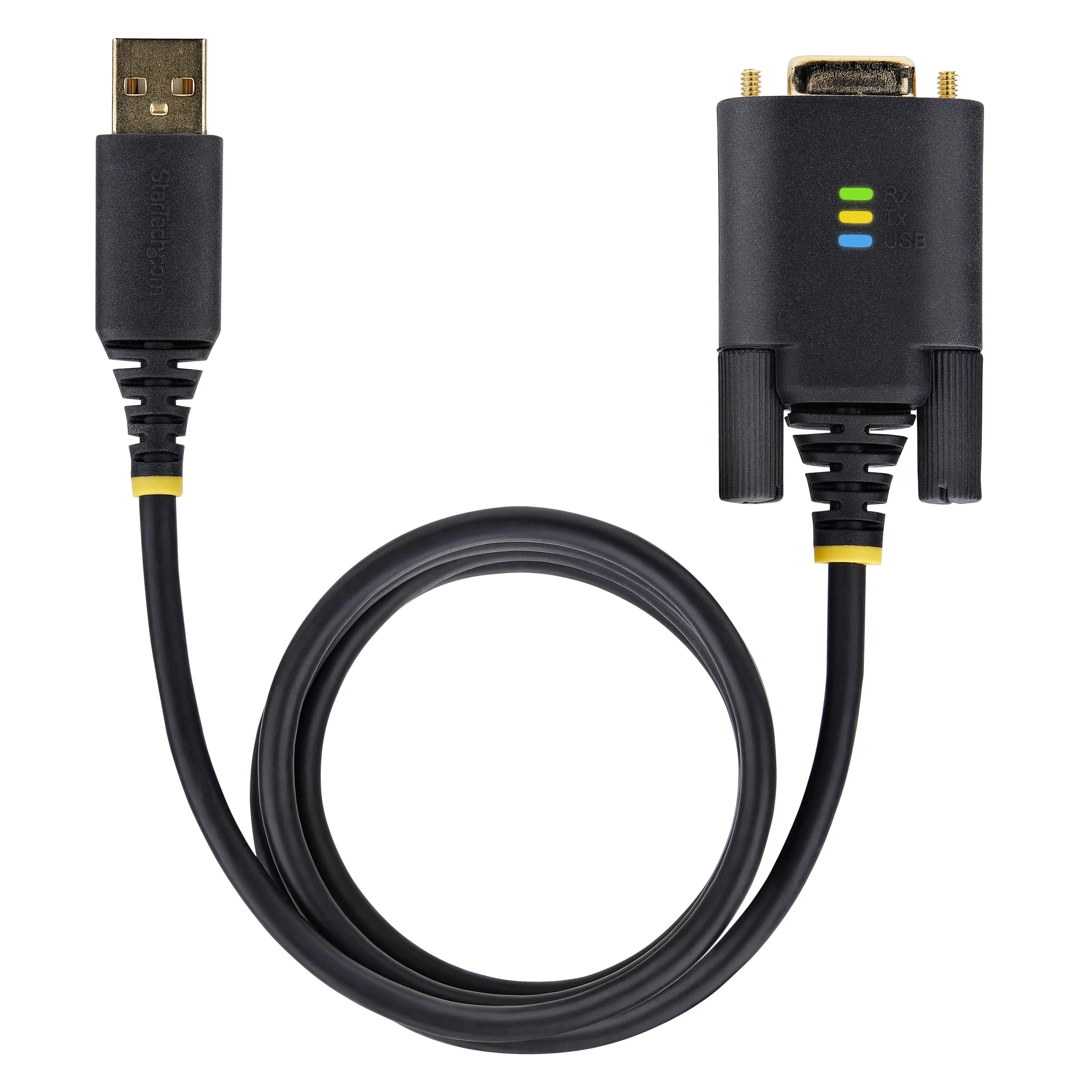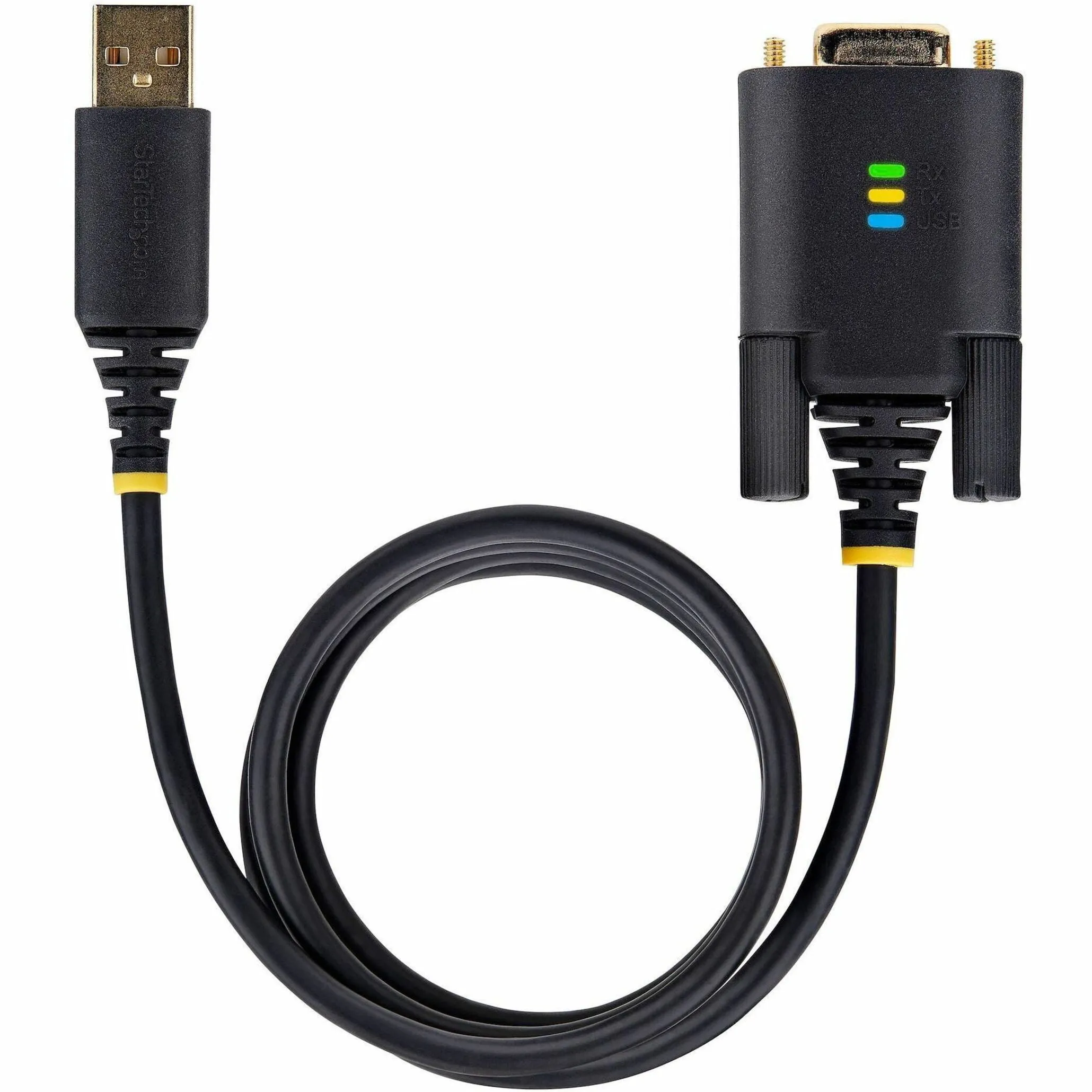 Add a DB9 RS-232 serial port to a desktop or laptop using a USB-A port - DB9 screws pre-installed; DB9 Nuts included for device/cable compatibility - Rugged TPE construction and level-4 ESD protection; Copper shielding; Gold plated connectors - Transmit/Receive LED indicators for port activity; USB LED for when the adapter has successfully enumerated on the desktop or laptop - Works with Windows/macOS/Linux; Max Baud 115.2Kbps; 128 Byte RX and 256 Byte TX FIFO; FTDI FT232R Chipset