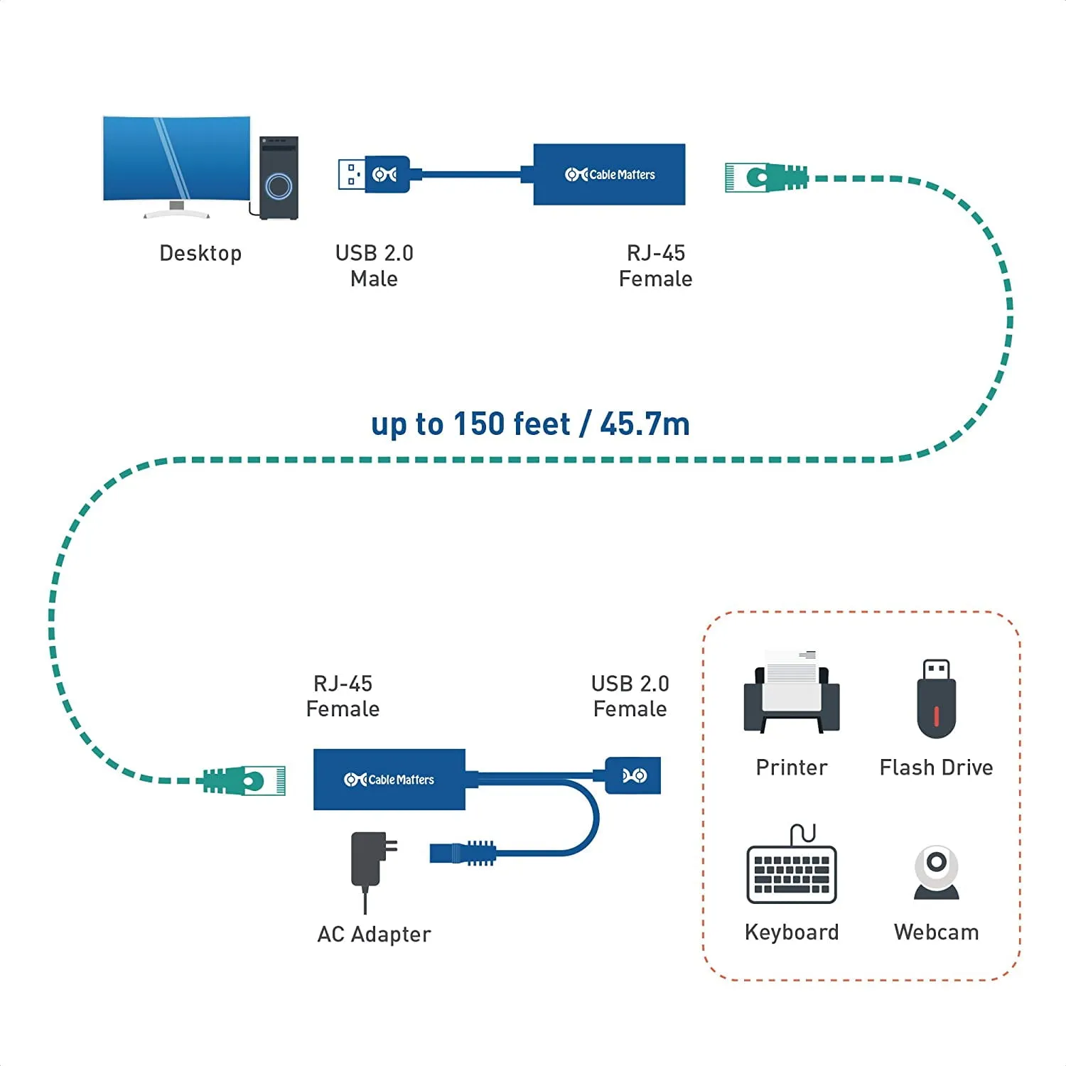 The USB Ethernet Extender is designed to transmit USB signals over long distances using an Ethernet cable, effectively extending the range of your USB devices.