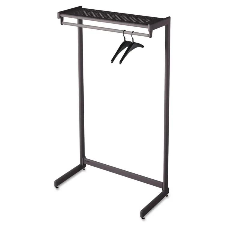 This single-side garment rack is perfect for showcasing apparel in retail or home settings. Made from durable, powder-coated textured steel, it features a spacious top shelf for additional storage. Measuring 48 inches wide, 18.5 inches deep, and 61.5 inches high, this coat rack combines functionality with a sleek black finish.