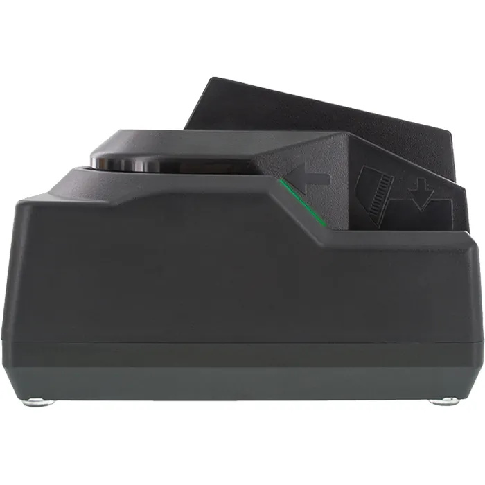 3-track integrated SCRA Reads ISO and AAMVA standard credit and debit cards and ID cards that encrypts card data at the point of swipe. Single feed Optimized to reduce transaction time and manual entry errors, the MICRSafe is a single-feed MICR reader with a reliable and durable design. Reads the data you need In a single pass, the MICRSafe reads E13B and CMC7 MICR fonts and connects to POS terminals through RS-232 AUX interface to output data to POS. Simplified connection Ideal for retail applications where fast and accurate MICR reading is required, the MICRSafe offers a range of interface options, including connectivity to the most popular POS terminals. Secured by the MagneSafe Security Architecture MagneSafe��� is a digital identification and authentication architecture that safeguards consumers and their personal data. Designed to exceed PCI regulations, MagneSafe leverages strong encryption, secure tokenization, counterfeit detection, tamper recognition, data relevance and integrity, and dynamic digital transaction signatures, which together validate and protect the entire transaction and each of its components.
