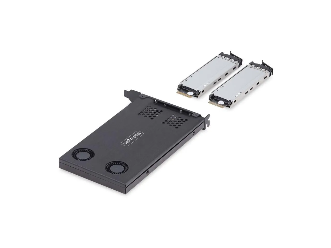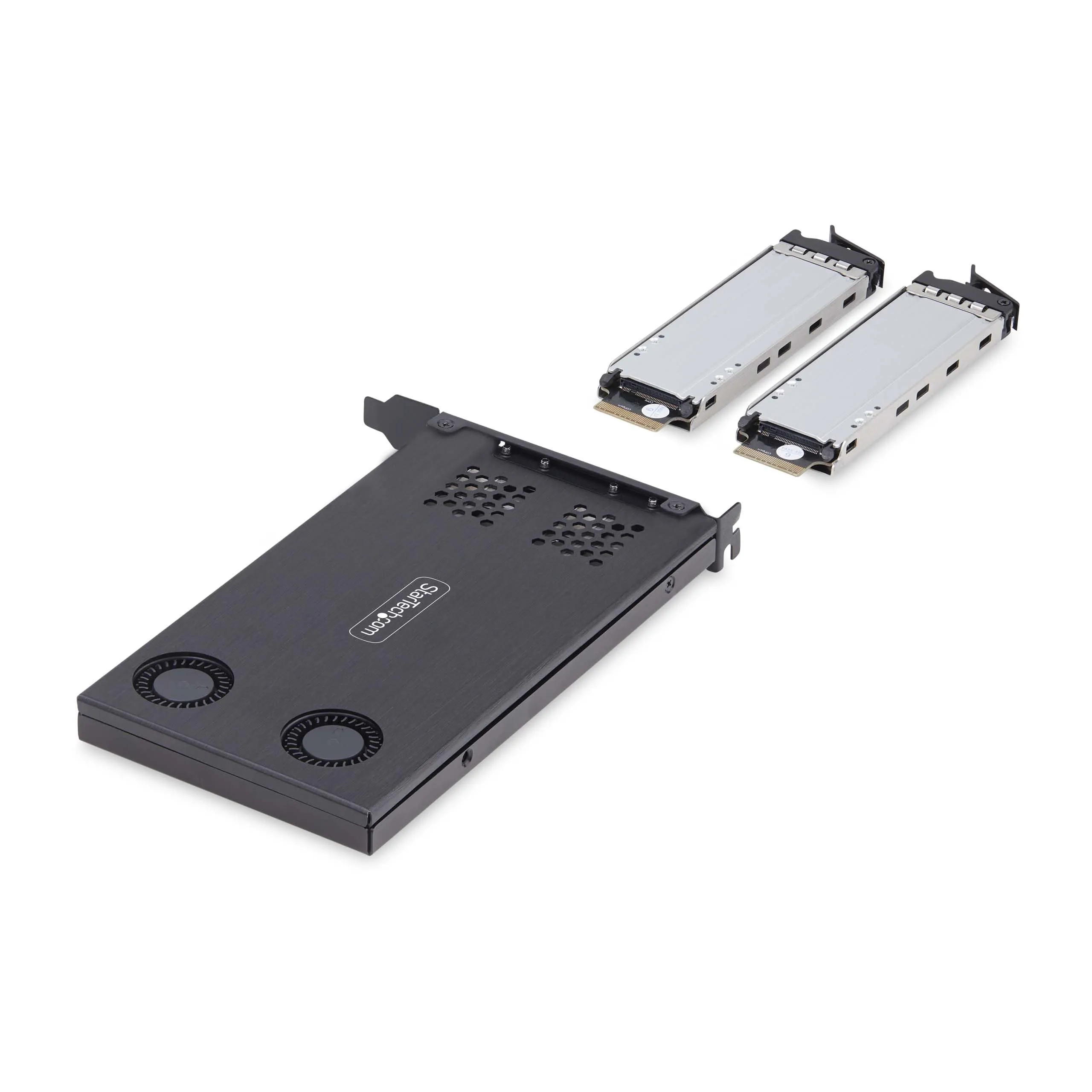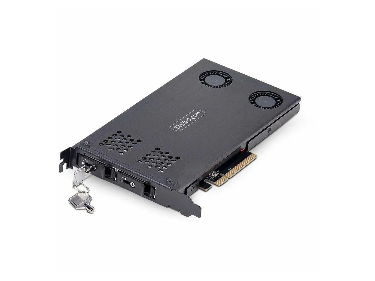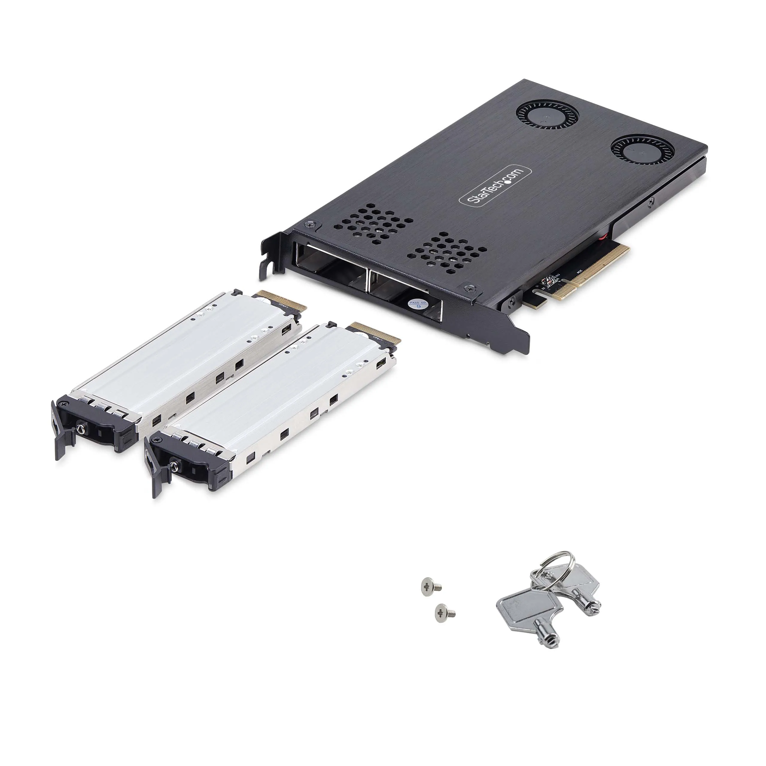 Utilize a PCIe x8/x16 slot as a removable drive bay for 2x M.2 NVMe SSDs (up to 2280); Capable of read/write speeds up to 64Gbps per drive - Toolless installation of drive to tray/tray to bay; Lockable Drive Tray (2 keys incl.) - Vented frame/active cooling fans aid heat dissipation; Thermal pad/anti-vibration springs on tray - No drivers required; PCI Express 4.0/3.0; PCIe bifurcation required; Not compatible with M.2 SATA drives; Additional drive trays sold separately (TR-M2-REMOVABLE-PCIE)