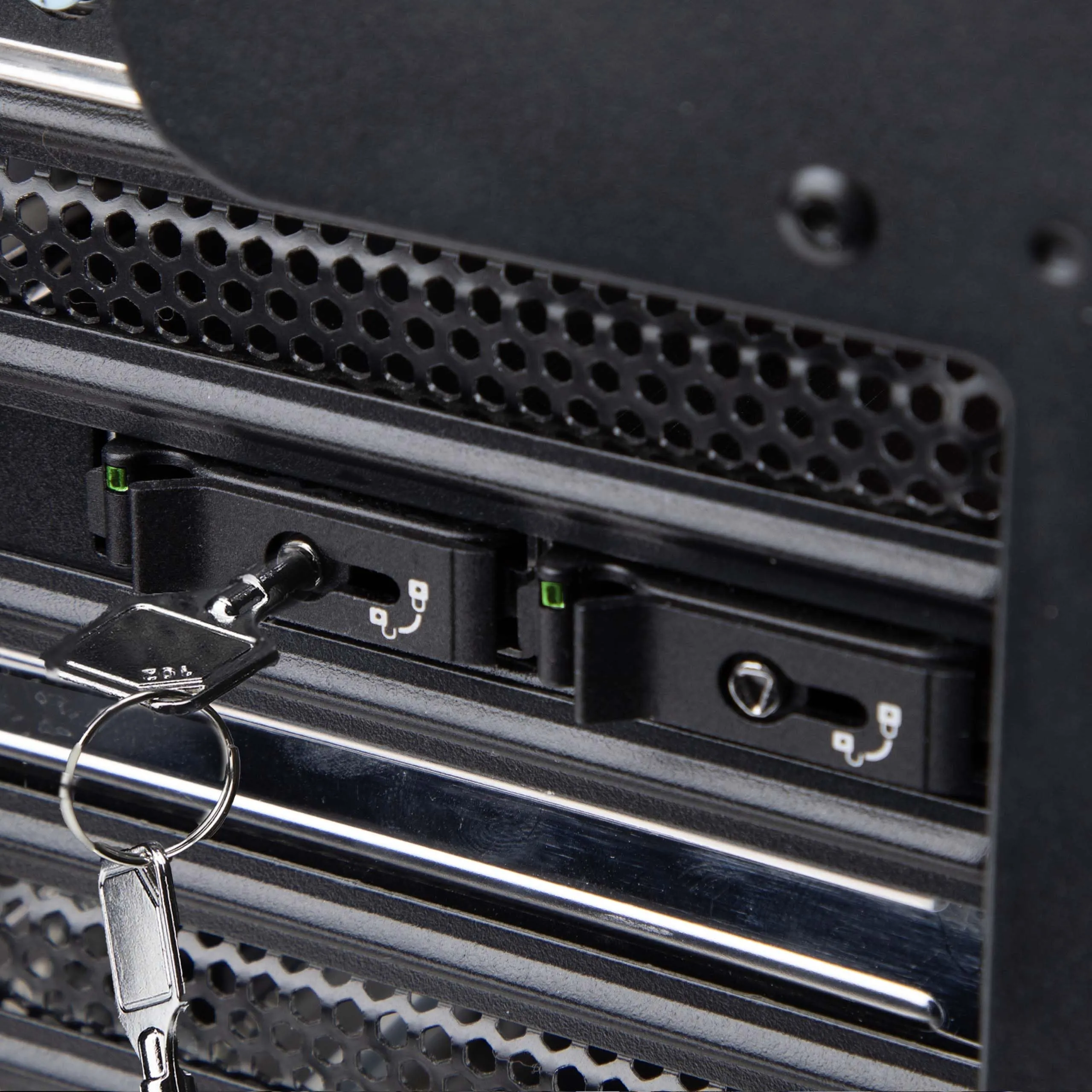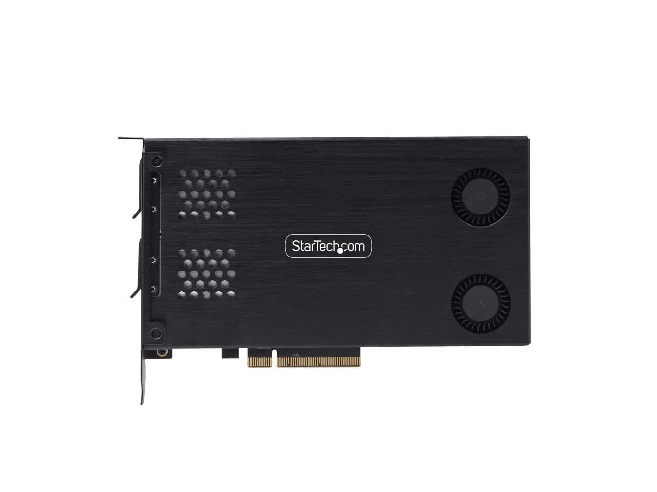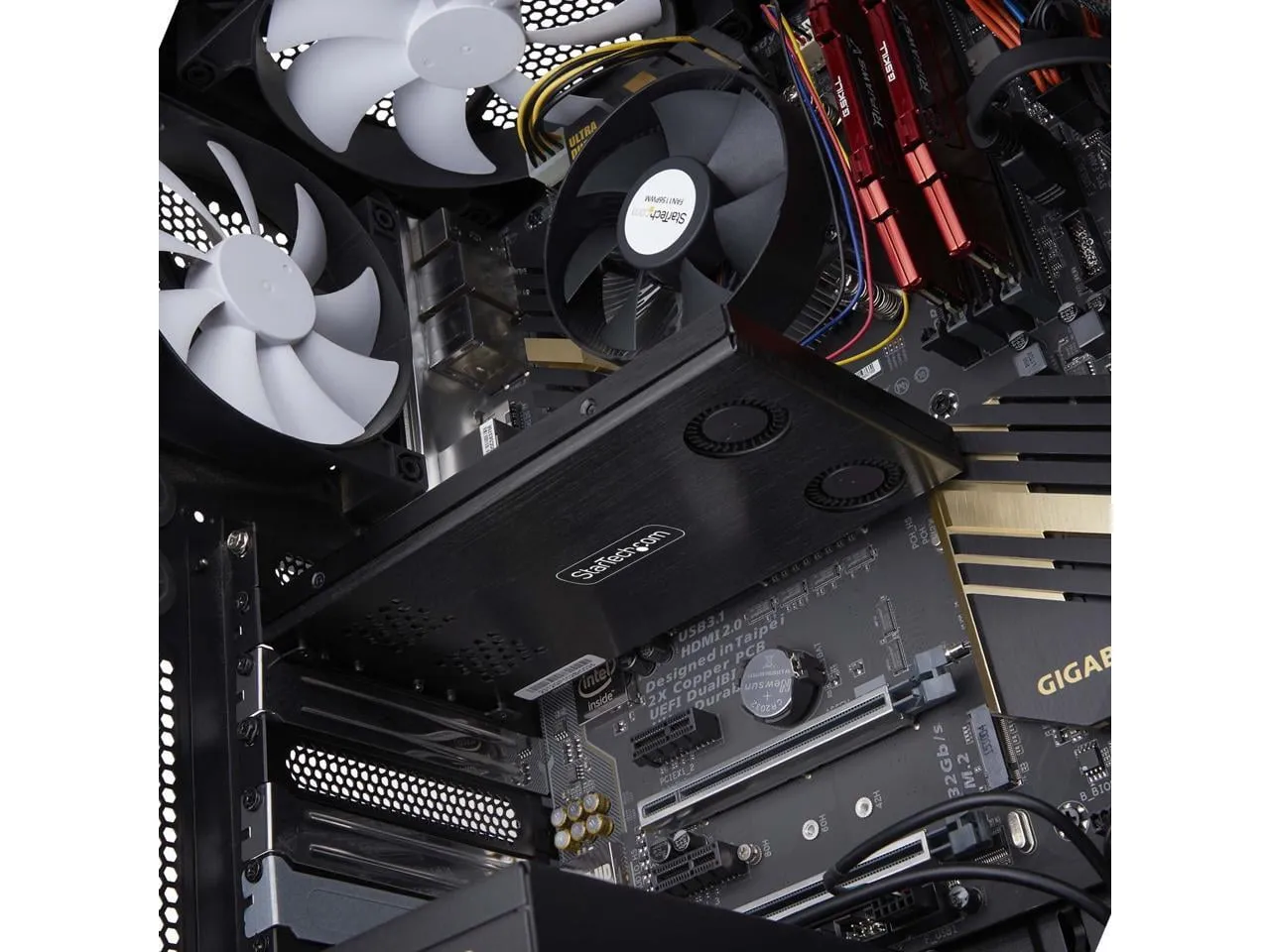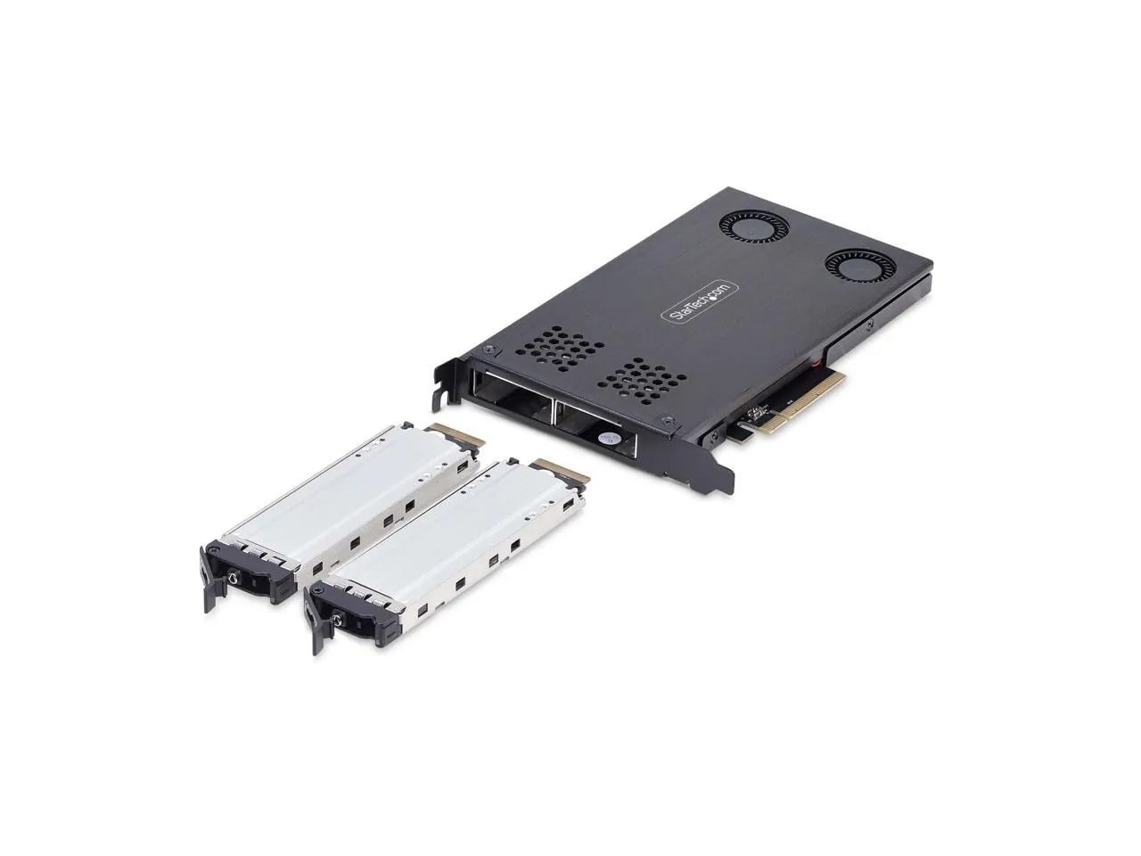 Utilize a PCIe x8/x16 slot as a removable drive bay for 2x M.2 NVMe SSDs (up to 2280); Capable of read/write speeds up to 64Gbps per drive - Toolless installation of drive to tray/tray to bay; Lockable Drive Tray (2 keys incl.) - Vented frame/active cooling fans aid heat dissipation; Thermal pad/anti-vibration springs on tray - No drivers required; PCI Express 4.0/3.0; PCIe bifurcation required; Not compatible with M.2 SATA drives; Additional drive trays sold separately (TR-M2-REMOVABLE-PCIE)