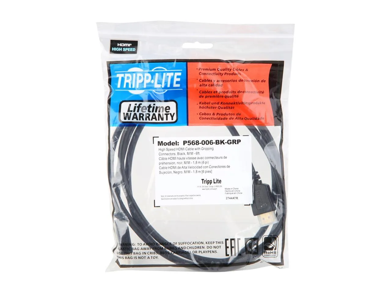 Tripp Lite High-Speed HDMI Cable w/ Gripping Connectors 4K M/M Black 6ft (P568-006-BK-GRP)