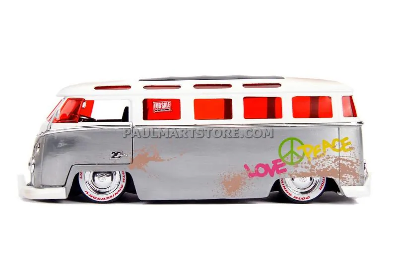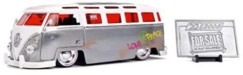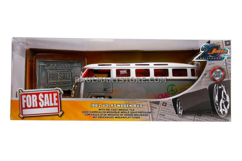 Brand new 1/24 scale diecast model of 1962 Volkswagen Bus "Hippie Van" Metal Raw with White Top (Dirty) "FOR SALE" "Jada 20th Anniversary" die cast model by Jada.