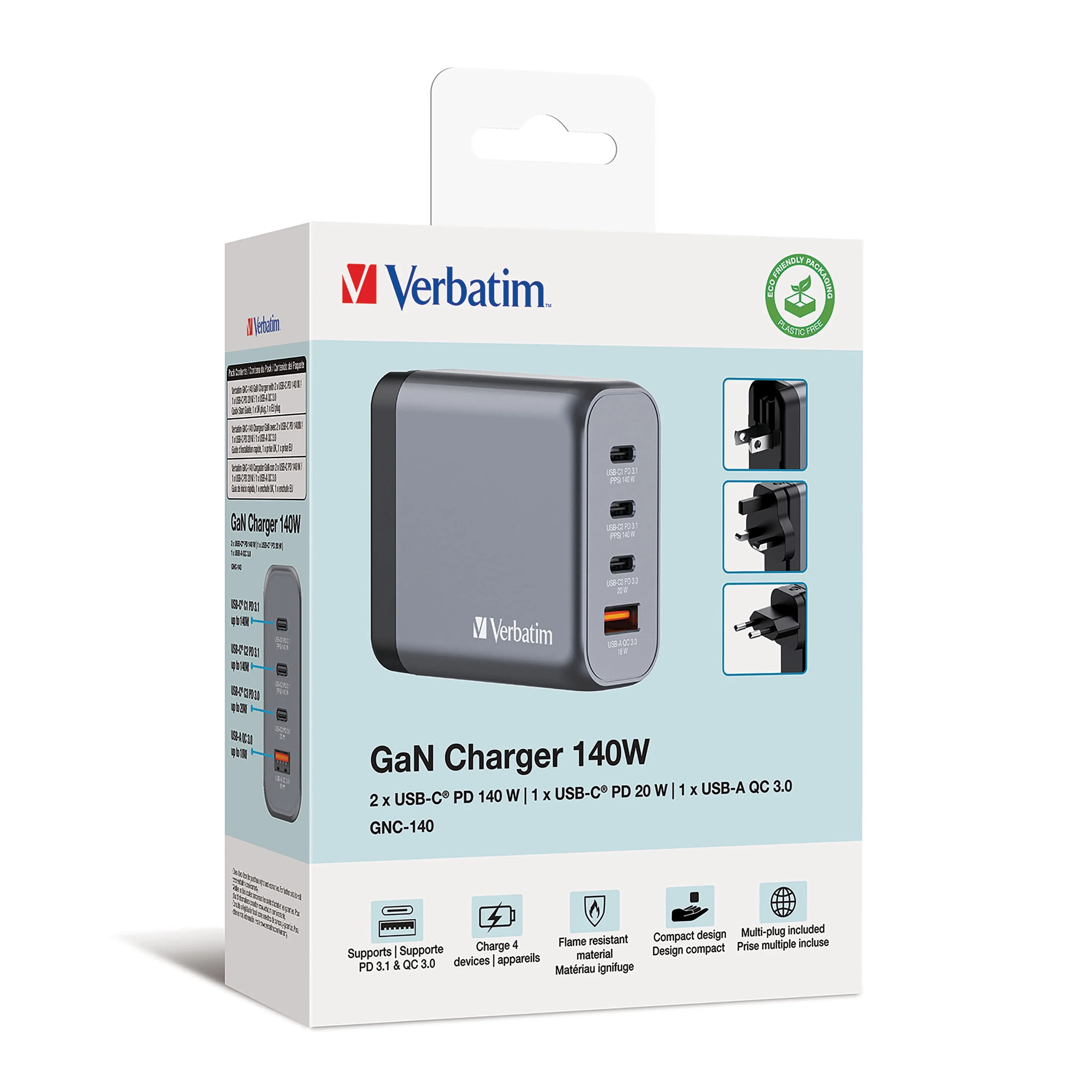 The Verbatim 140W GaN Wall Charger is designed for efficiency and portability, featuring three USB-C PD ports and one USB-A QC 3.0 port. This compact charger is perfect for your office, home, or travel needs, capable of charging tablets, smartphones, gaming devices, and more. Its foldable US prongs and interchangeable EU and UK plugs make it an ideal travel accessory. With advanced Gallium Nitride (GaN) technology, it offers fast, efficient charging while generating less heat, allowing for a lighter and smaller design. Built with high-quality, flame-resistant materials, this charger includes four safety protection systems to ensure safe charging experiences.