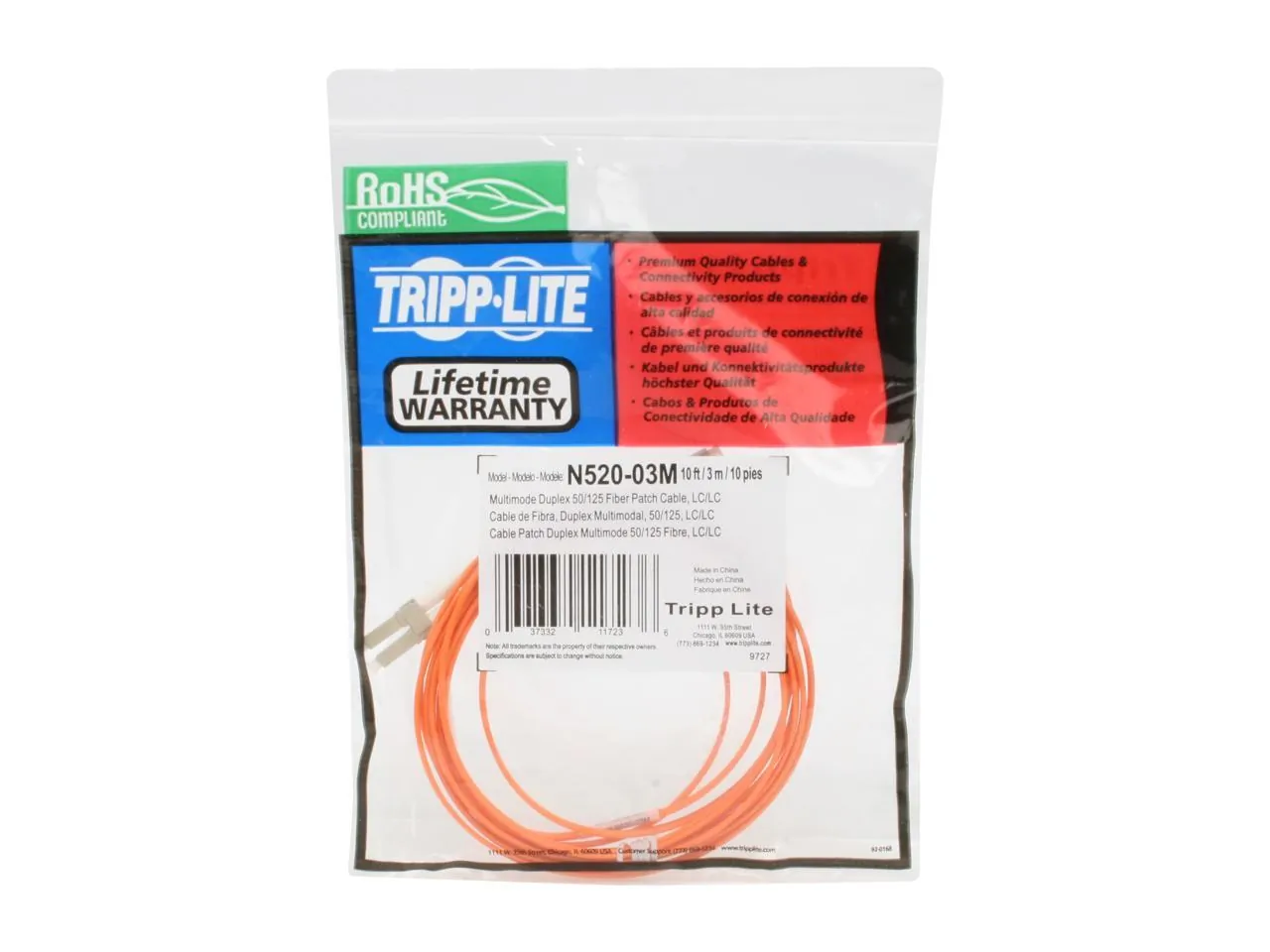 Tripp Lite's 3-meter multimode duplex Fibre Channel optic LC/LC patch cable is manufactured from 50/125 zipcord fiber. The cable has LC connectors on each end. It has a PVC jacket and is FDDI and OFNR rated. 50/125 Duplex multimode fiber is most commonly used in Fibre Channel applications. It is backward compatible with 62.5 micron fiber and provides built-in headroom for future applications. The cable provides higher bandwidth optimized for Gigabit and 10Gbps networks as well. Also available in 1, 2, 5, 10, 15, 20, 25, 30, and 50 meter lengths. Enter "N520-" in the search field to bring up all lengths. For LC-SC cables, search "N516-", and for SC-SC, search "N506-". Tripp Lite warrants this product to be free from defects in materials and workmanship for life.