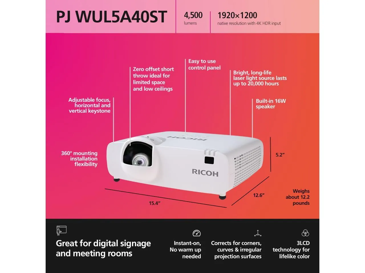 The RICOH PJ WUL5A40ST is a state-of-the-art projector designed to deliver stunning visuals with 4K resolution. Perfect for business presentations and home entertainment, this projector offers impressive brightness and clarity. With a compact design, it easily fits into any setting.