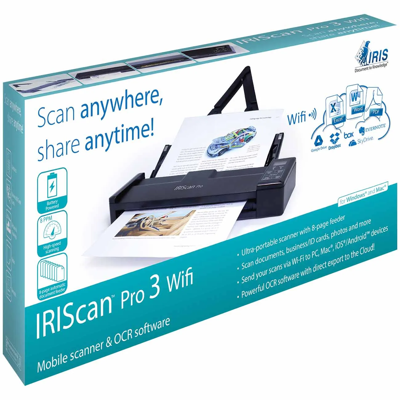 Ultra-compact, lightweight and portable, the battery-powered IRIScan Pro 3 Wifi is the ultimate tool to beat paper. Perfect for scanning just about anything at home or on the go, it allows mobile users to easily capture documents, invoices, business/ID cards, receipts and more, without a computer!