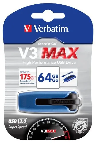High-performance USB 3.0 Drive offers the ultimate in speed and a 64GB capacity. Move music or video libraries quickly and easily with transfer speeds up to 175MB per second. The dual-channel USB 3.0 interface offers faster data-transfer speeds vs. single-channel USB 3.0, making it easy to transfer multiple files at once or larger files without error. The retractable design keeps the connector and data protected without the worry of losing a cap. Store 'n' Go V3 MAX also features premium housing with a blue metallic finish. Drive interfaces with USB 3.0 and is 100 percent compatible with USB 2.0. Compatible operating systems include Windows XP, Vista, and Windows 7 and higher; Mac OS X 10.1 and higher; Linux kernel 2.6 and higher.