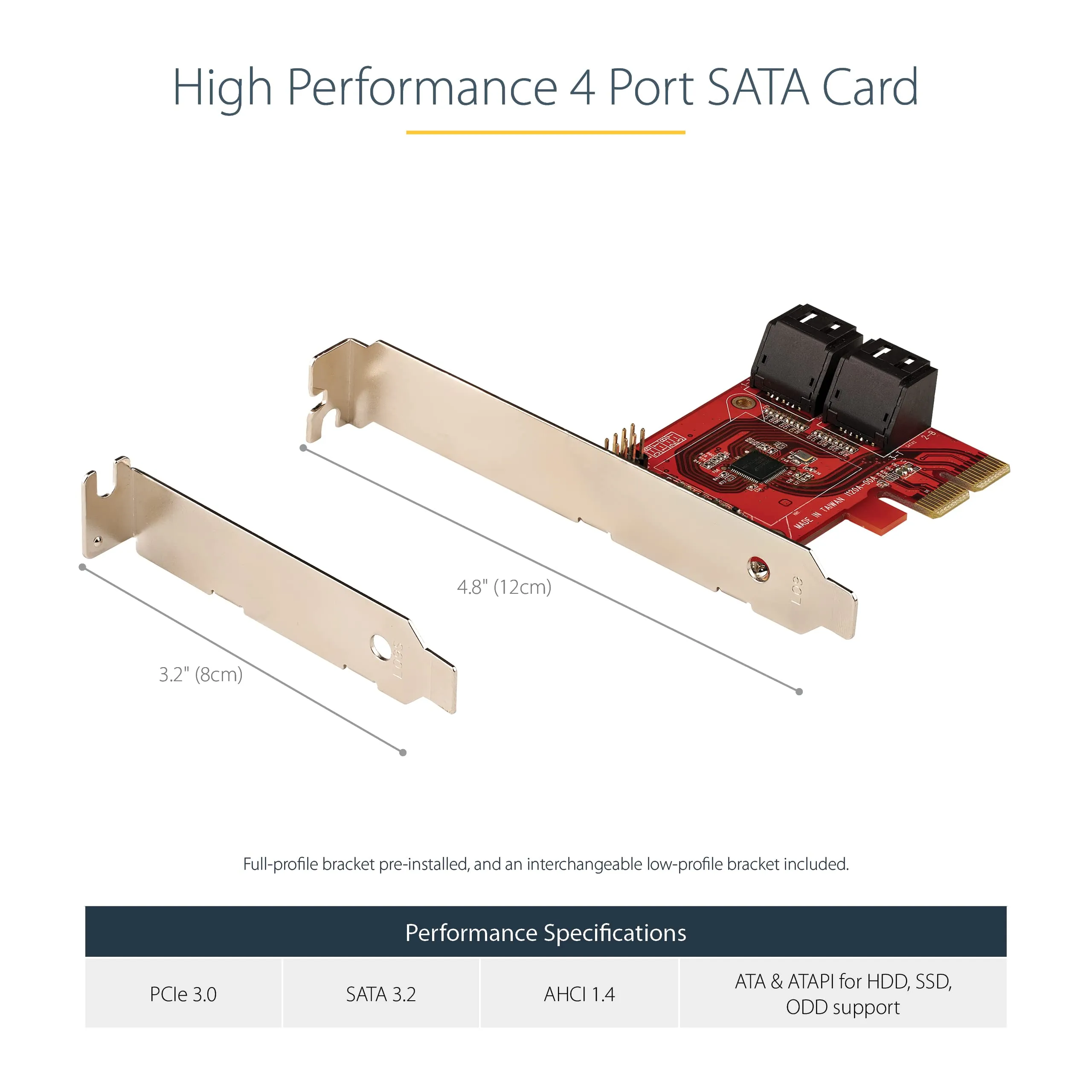 Enhance your system's connectivity with the StarTech 4 Port PCIe SATA Expansion Card. Designed for high-speed data transfer, this expansion card provides four additional SATA ports, allowing you to connect multiple SATA drives simultaneously.