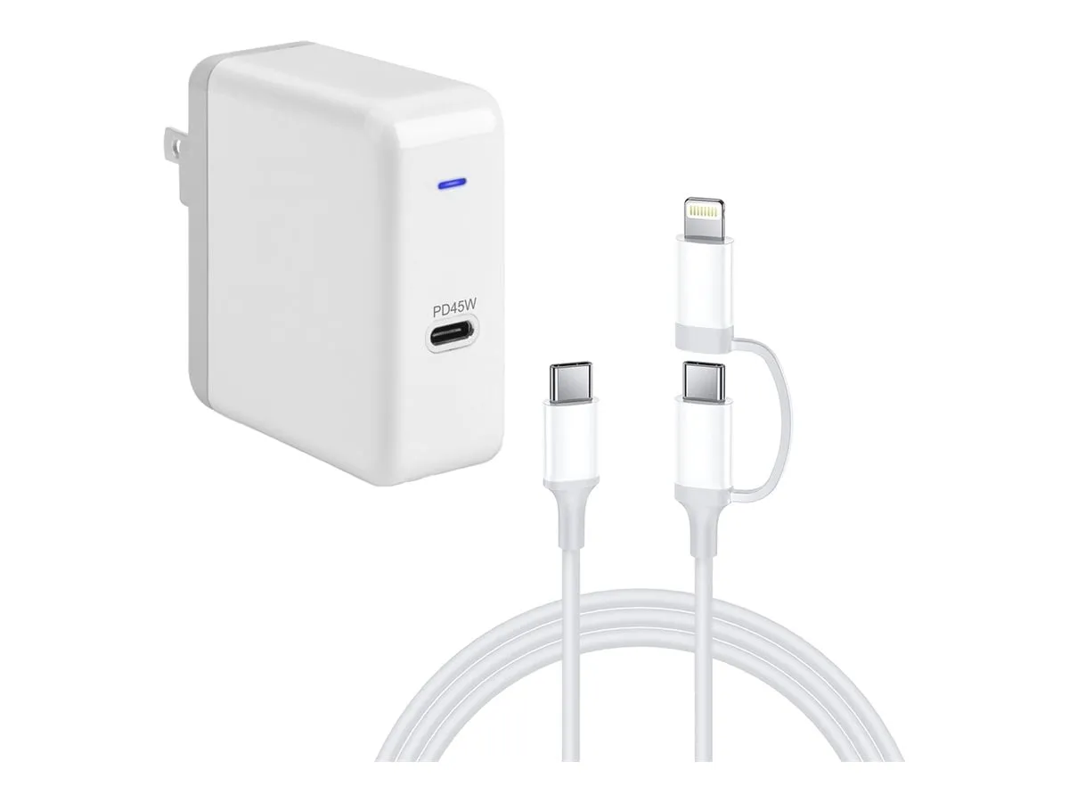 Experience fast charging and data transfer with our 45W USB-C Power Adapter. This versatile charger is perfect for powering your devices while on the go. Included is a durable 3FT USB-C to USB-C Lightning cable, ensuring compatibility with various devices for seamless connectivity.
