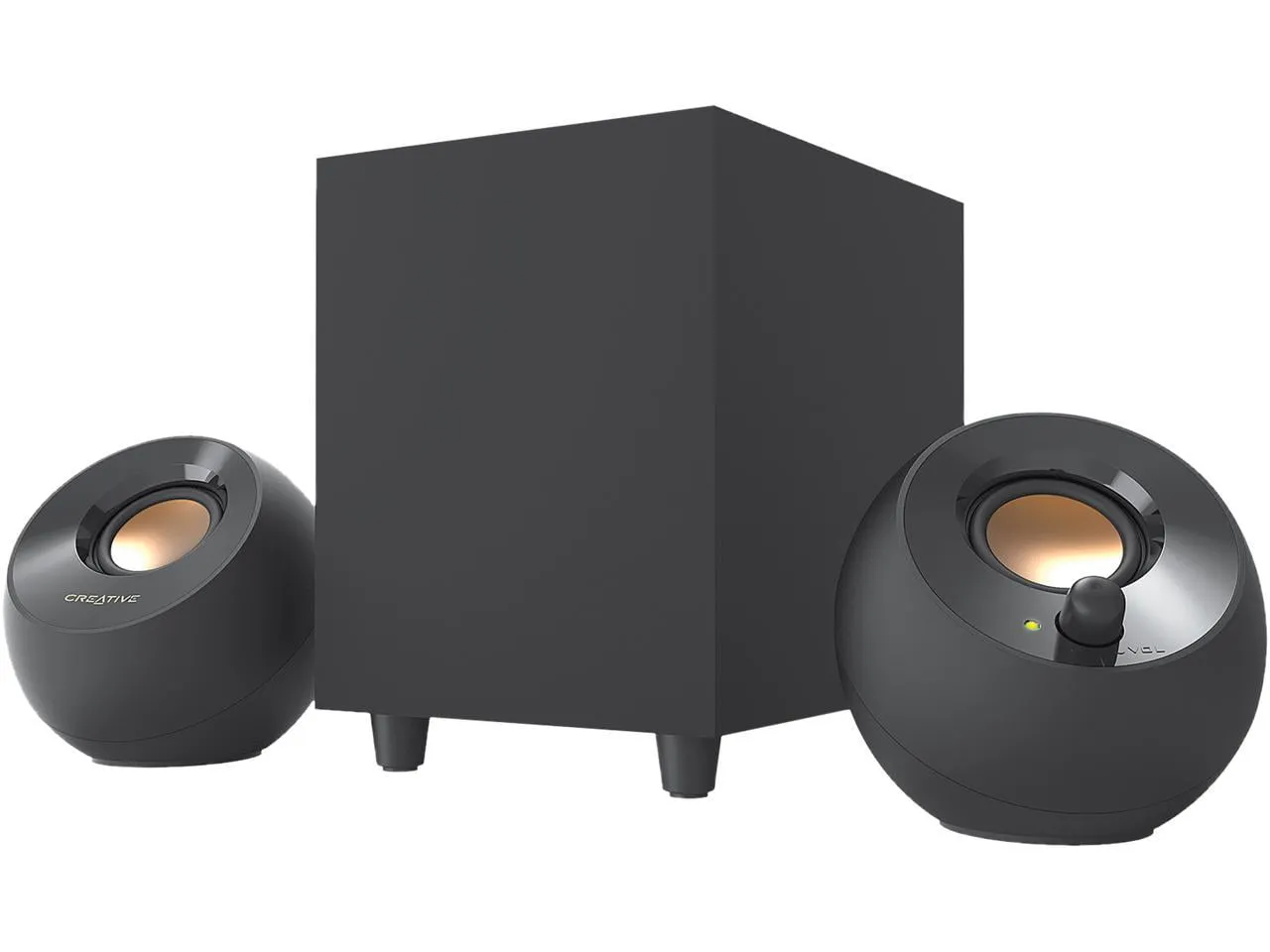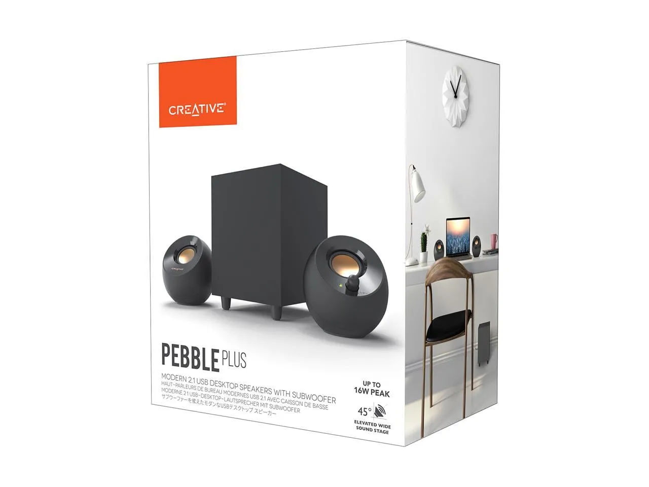 The Creative Pebble Plus 2.1 Speaker System delivers an immersive audio experience with powerful bass and crystal-clear highs. With a compact design, it's perfect for desktops and small spaces, making it an ideal choice for gaming, music, and movies.