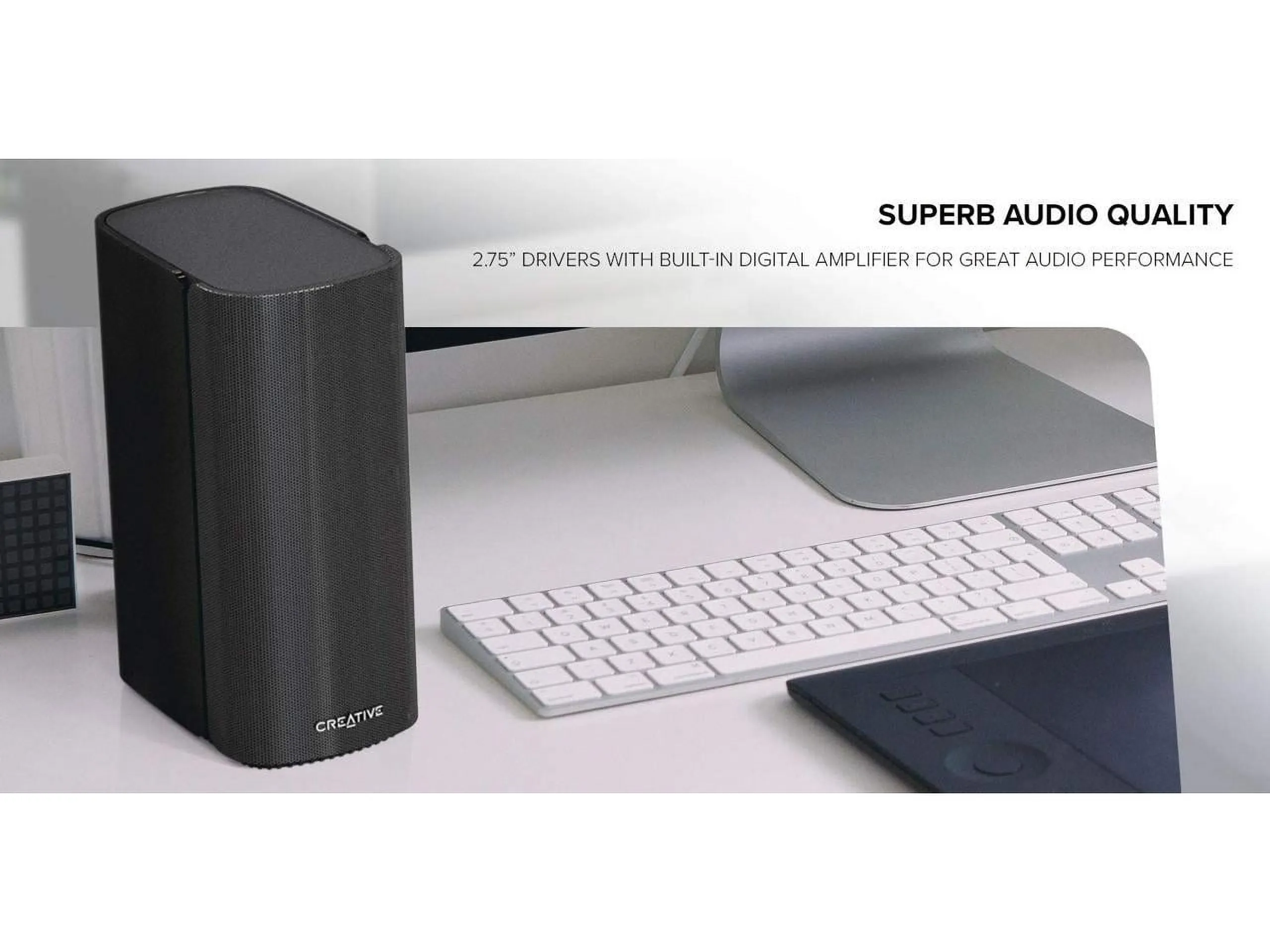 Experience stunning audio quality with the Creative T100 2.0 Wireless Speaker. Designed for optimal performance, this sleek speaker features advanced connectivity options including an optical input, providing crystal-clear sound for your music, movies, and games.
