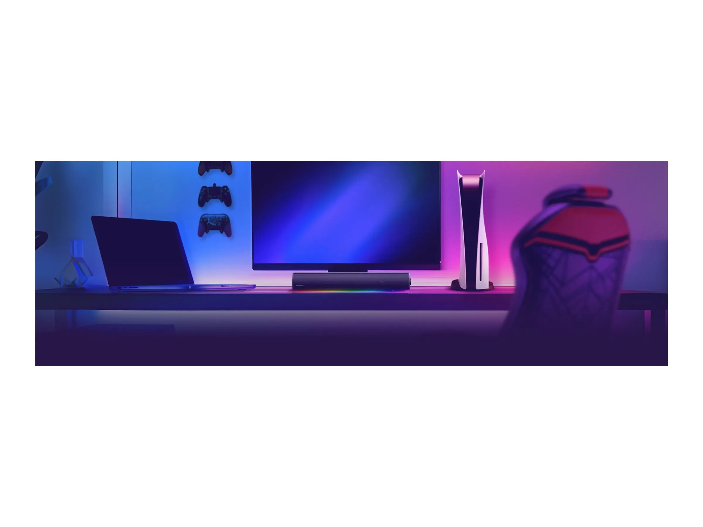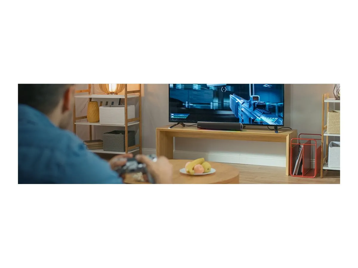 The Sound Blaster GS5 Gaming Soundbar is your ultimate audio companion, expertly crafted to elevate your gaming and entertainment experience. With its powerful audio performance and immersive soundstage, this soundbar is perfect for use under your TV or desktop monitor. Enjoy stunning RGB lighting that enhances your setup while benefiting from versatile connectivity options, including Optical in, USB-C, AUX input, Bluetooth 5.3, and a dedicated headphone output port.