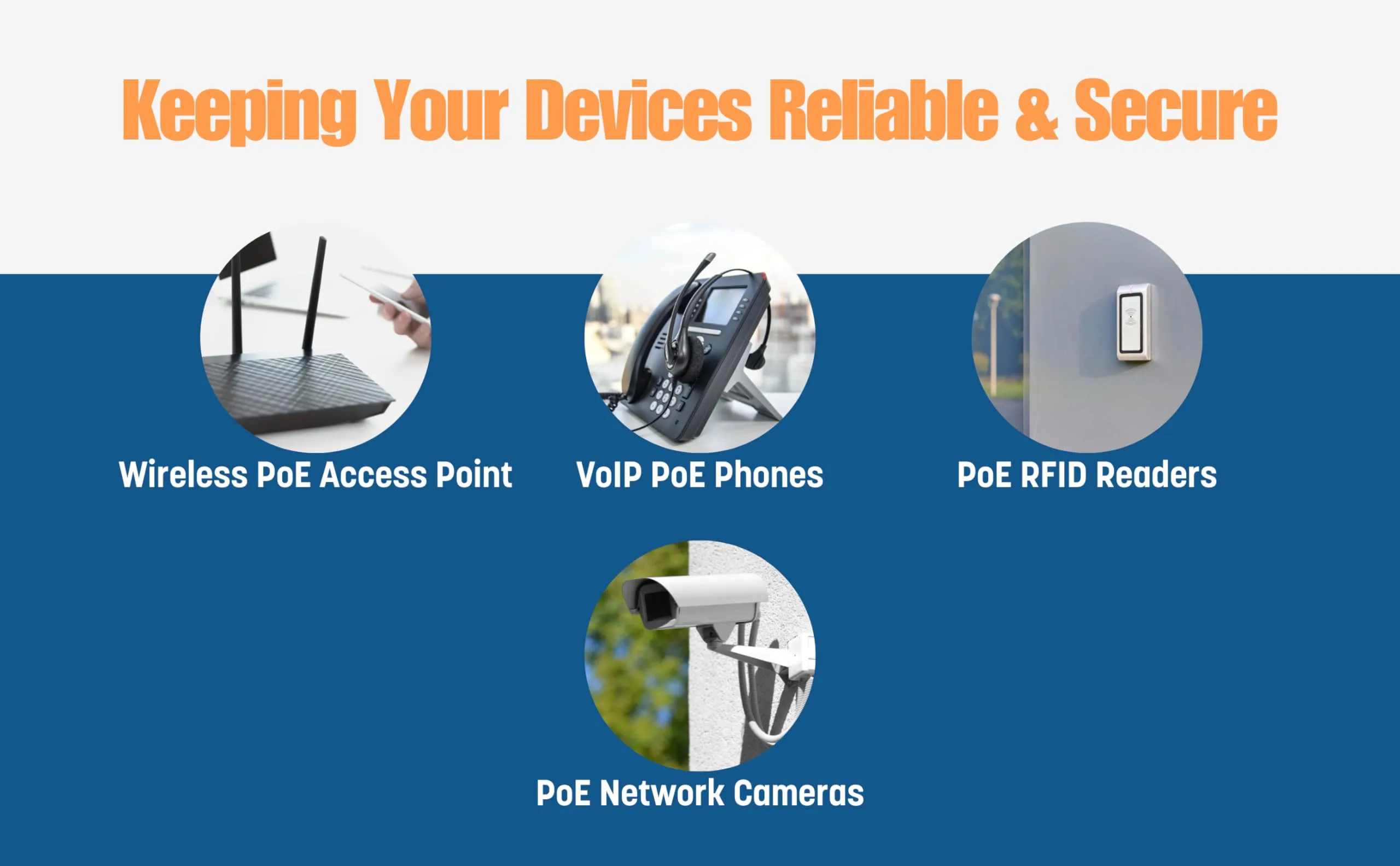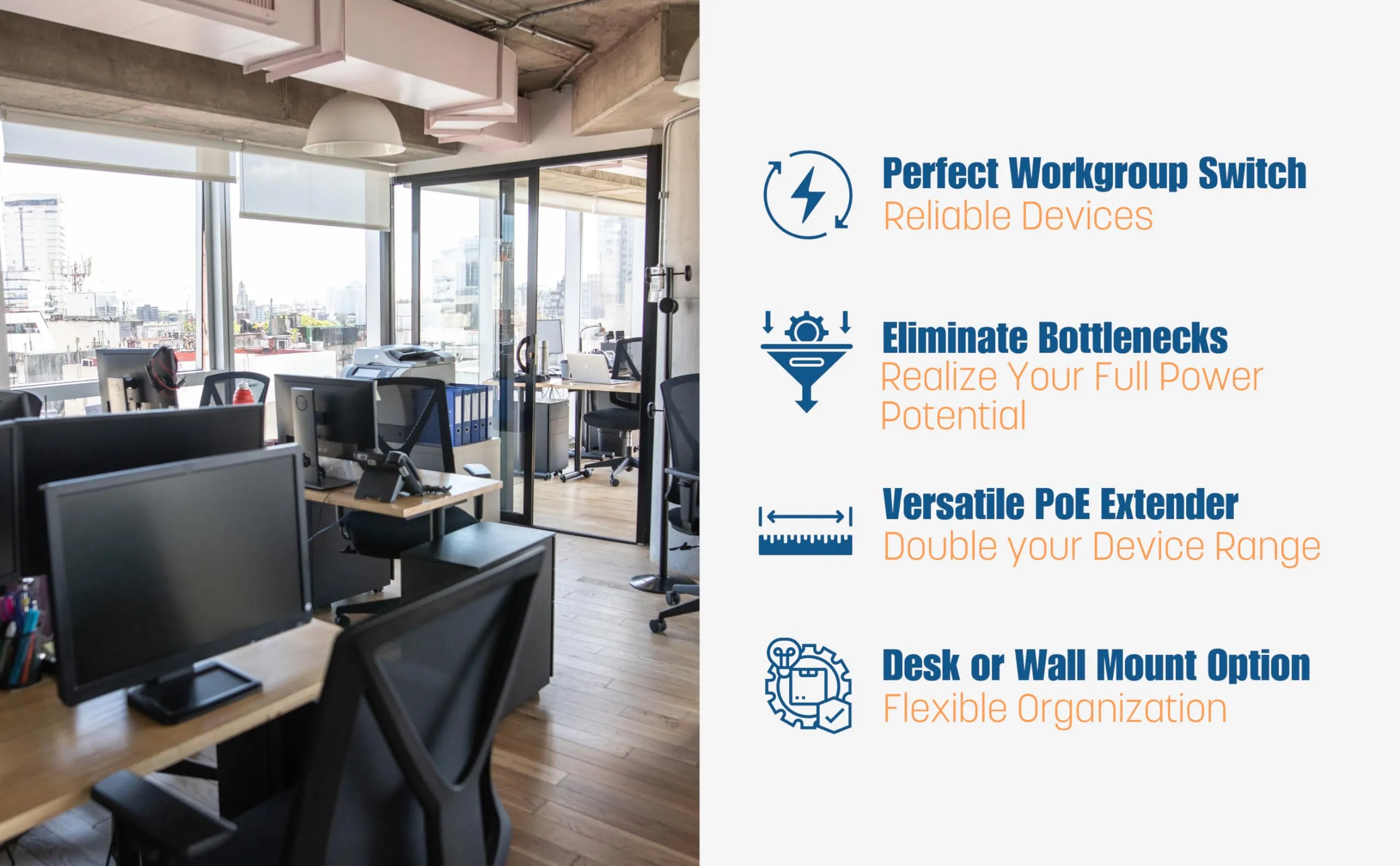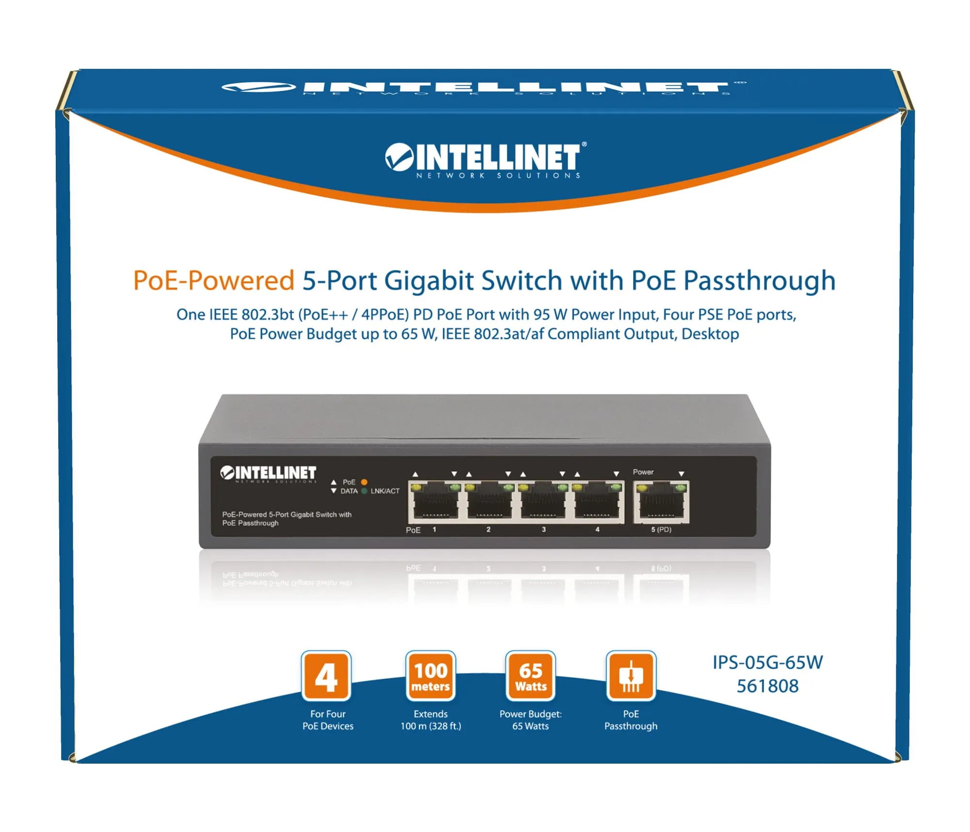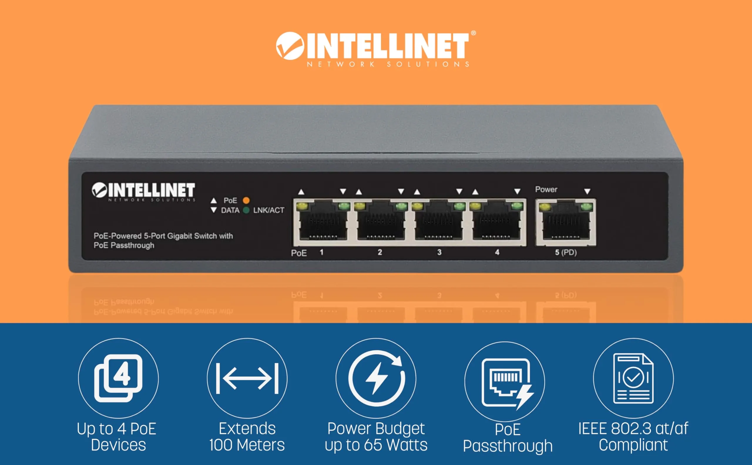 The 5-Port PoE Switch offers flexible power options, supporting up to 95 W power input from a PoE injector or switch. It provides power and data to up to four PoE network devices while significantly extending the connection distance from 100 m (328 ft.) to 200 m (656 ft.). The device can be powered via PoE or the included power adapter.