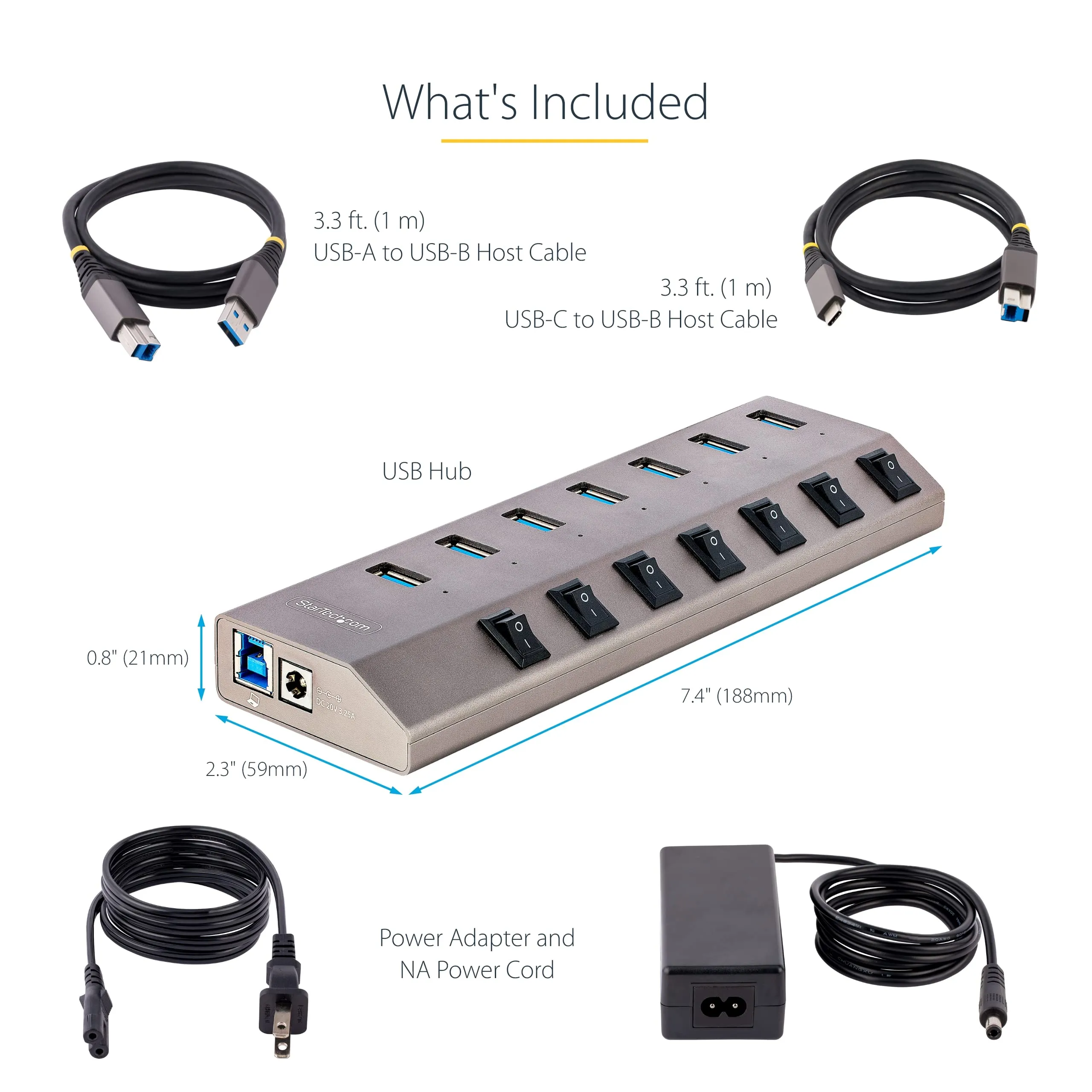It comes with a 65W power supply, ensuring that each port can deliver BC 1.2 1.5A (7.5W) of power simultaneously. The hub supports CDP/DCP, providing power access even when your host computer is not connected. Included are both USB-C and USB-A host cables, each measuring 3.3 feet (1 meter).