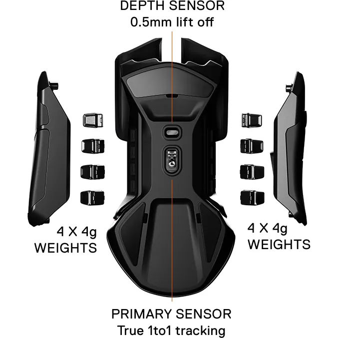 Exclusive TrueMove3 12,000 CPI, 350 IPS optical 1 to 1 tracking esports sensorThe world's lowest and most accurate lift off distance256 center of gravity weight tuning configurationsSplit-trigger 60-million Click Mechanical SwitchesRevolutionary silicone side grips for increased grip and durability8-Zone RGB illumination with Discord notificationsSave sensor settings, macros, and lighting effects on-board