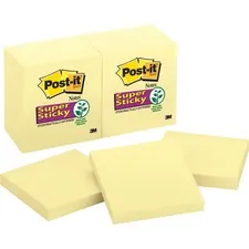 Post-it Super Sticky Notes feature a unique adhesive so your notes will stick securely to more surfaces. Now you can stick your notes where they'll really get noticed - like monitors, doors and walls. In a perfect 3" x 3" size for reminders or a short to-do list, Super Sticky Notes hold longer and stronger than original notes yet remove cleanly. Familiar and attention-getting, Canary Yellow Notes help get your message across. Super Sticky Post-it Notes are recyclable, and the paper in Post-it Notes is sourced from certified, renewable and responsibly managed forests.