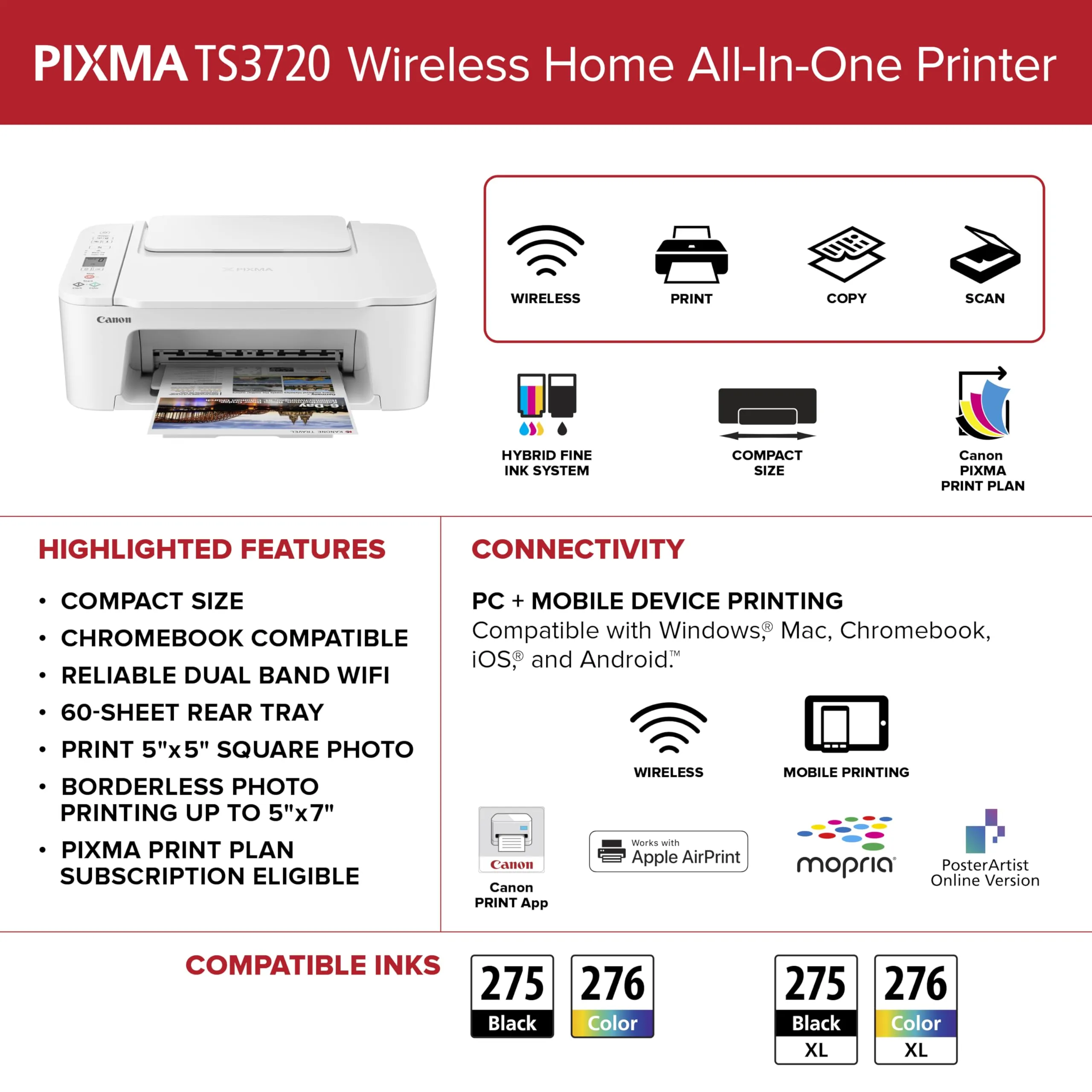 With easy mobile printing features, users can print from their smartphones or tablets effortlessly. The TS3720 also supports a variety of paper sizes and types, accommodating all your printing needs.
