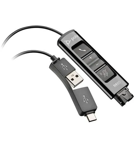 The Poly DA85 USB to QD Adapter is designed for flexibility and ease of use, featuring built-in USB-A and USB-C connectors for seamless connectivity. This adapter includes inline controls for quick adjustments and a unique single hold button for managing audio and video. It ensures comprehensive backwards compatibility with any Poly QD (Quick Disconnect) headset and offers intelligent headset recognition for a hassle-free experience. Stay updated with remote firmware updates and cloud systems.