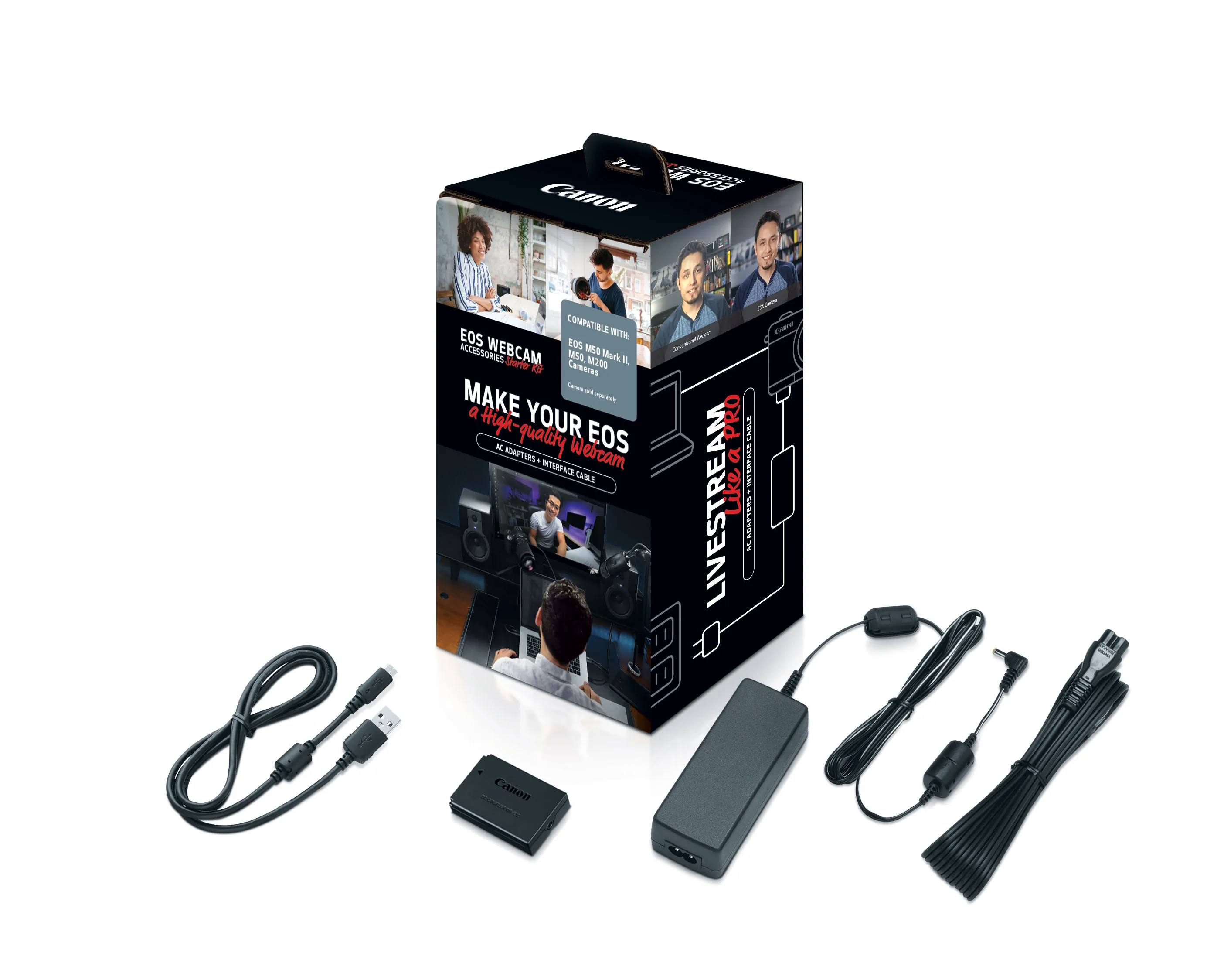 The Canon EOS Webcam Accessory Starter Kit is designed specifically for the EOS M50 Mark II, M50, and M200 cameras. This kit provides essential accessories to enhance your webcam experience, making it easy to stream and connect with others.