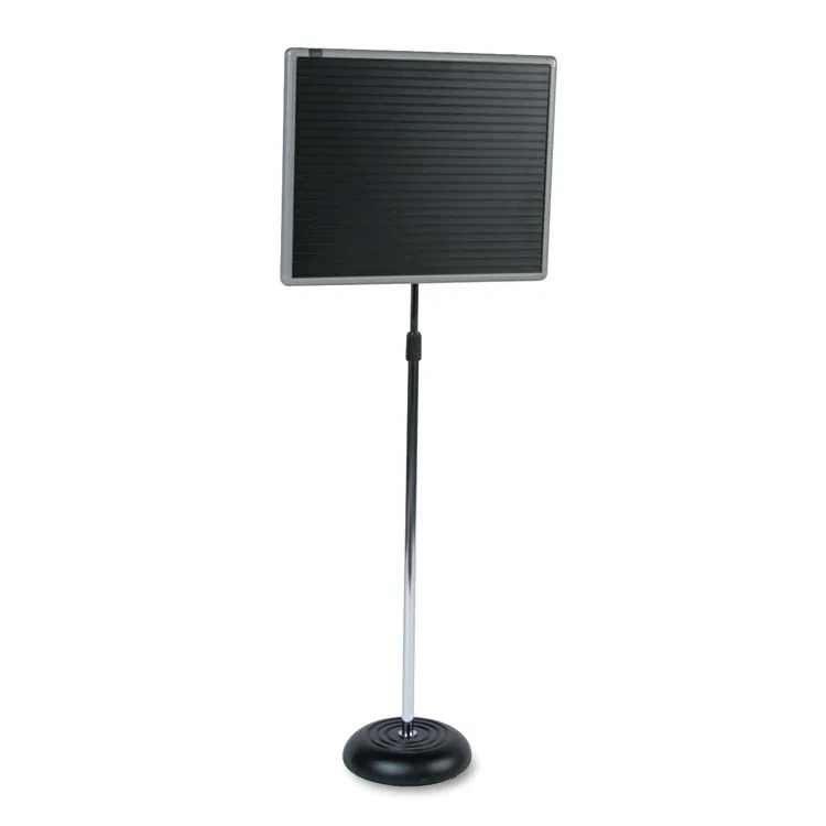 This Adjustable Single-Pedestal Magnetic Letter Board features a durable black surface and a sleek gray frame, making it perfect for homes, schools, and offices. The 24 x 18 inch size allows for clear messaging and easy visibility. Its adjustable pedestal allows for comfortable viewing at varying heights.