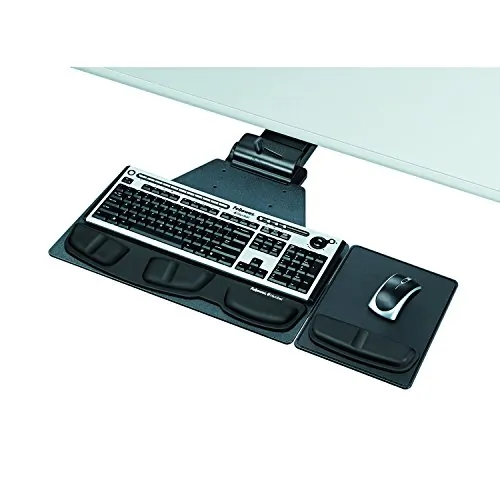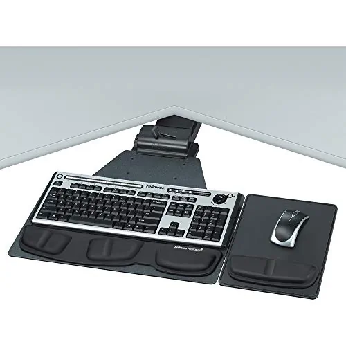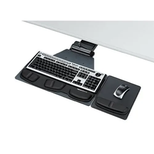 Fully adjustable keyboard tray promotes neutral hand/wrist position with height and tilt indicators that let you customize keyboard tray settings. Comfort-Lift system lets you slide mouse platform left or right over keyboard numeric pad and offers two custom height positions. Mouse platform tilts forward or backward and adjusts up or down to height of keyboard. Mouse platform tilts forward or backward and adjusts up or down to height of keyboard. Mousing surface mounts on the left or right of the keyboard. Warning Trak helps prevent mouse from sliding off mousing platform. Lift and lock feature lets you adjust height with one hand. The durable keyboard platform with soft gel wrist support fits most corner and standard workstations. Health-V memory foam supports with Microban antimicrobial protection. Track length measures 25". Platform measures 19" x14-3/4". Tray meets or exceeds applicable ANSI/BIFMA standards.