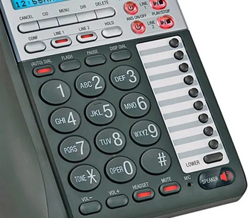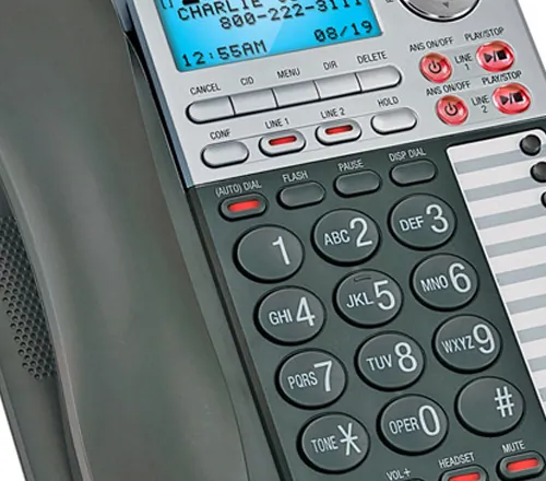 This two-line speakerphone is perfect for small businesses that need two-line support and a variety of features. Fully integrated, digital answering machine records up to 12 minutes of incoming messages, outgoing announcements and memos. Caller ID/Call Waiting allows you to view the name, number, time and date of incoming calls at a glance, even those on call waiting. ClearSpeak dial-in-base speakerphone lets you talk and listen without holding the handset to leave your hands free to do other things and allow more people in on the conversation. 100 name/number phonebook lets you quickly store and dial frequently called numbers. With three-party conferencing, you can have a three-way conversation between you and two other parties. Two-line phone also features auto line selection, line power mode, selectable ringer tones, chain dialing, ringer volume control, hearing aid compatibility and more.