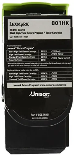 Marketing Information:Toner cartridge features the Unison Toner's unique formulation that consistently delivers outstanding image quality, ensures long-life print system reliability and promotes superior sustainability - all in an innovative, shake-free print system. Genuine Lexmark toner is engineered to work best together with your Lexmark printer, delivering excellent print quality from the first page to the last. Cartridge is designed for use with CX410de, CX410e, CX410dte, CX510de, CX510dhe and CX510dthe. Lexmark Return Program cartridges are patented print cartridges sold at a discount in exchange for the customer's agreement to the license requirement that the cartridges will be used only once and returned only to Lexmark for remanufacturing or recycling. These patented cartridges are licensed for single use only and will stop working after delivering a fixed amount. Cartridge yields approximately 4,000 pages.