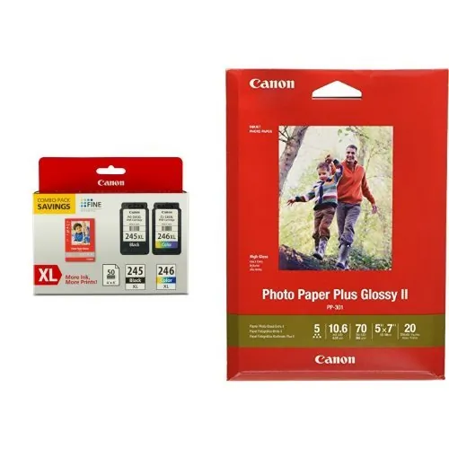 Experience crisp, smudge-resistant professional quality text with the PG-245XL pigment black ink and CL-246XL color cartridge plus the vibrant, glossy paper gives you crisp, clear pictures that are high quality without the high cost--an economical choice for great prints. The ink is designed with FINE full photolithographic inkjet nozzle engineering technology. Your documents will realize added sharpness, detail and quality. When printing with genuine Canon inks and photo papers, the ChromaLife100 system gives you beautiful photos and amazing longevity. Device Types: Inkjet Printer Colors: Black Tri-Color Page-Yield: 180 300 Supply Type: Ink/Paper Combo.