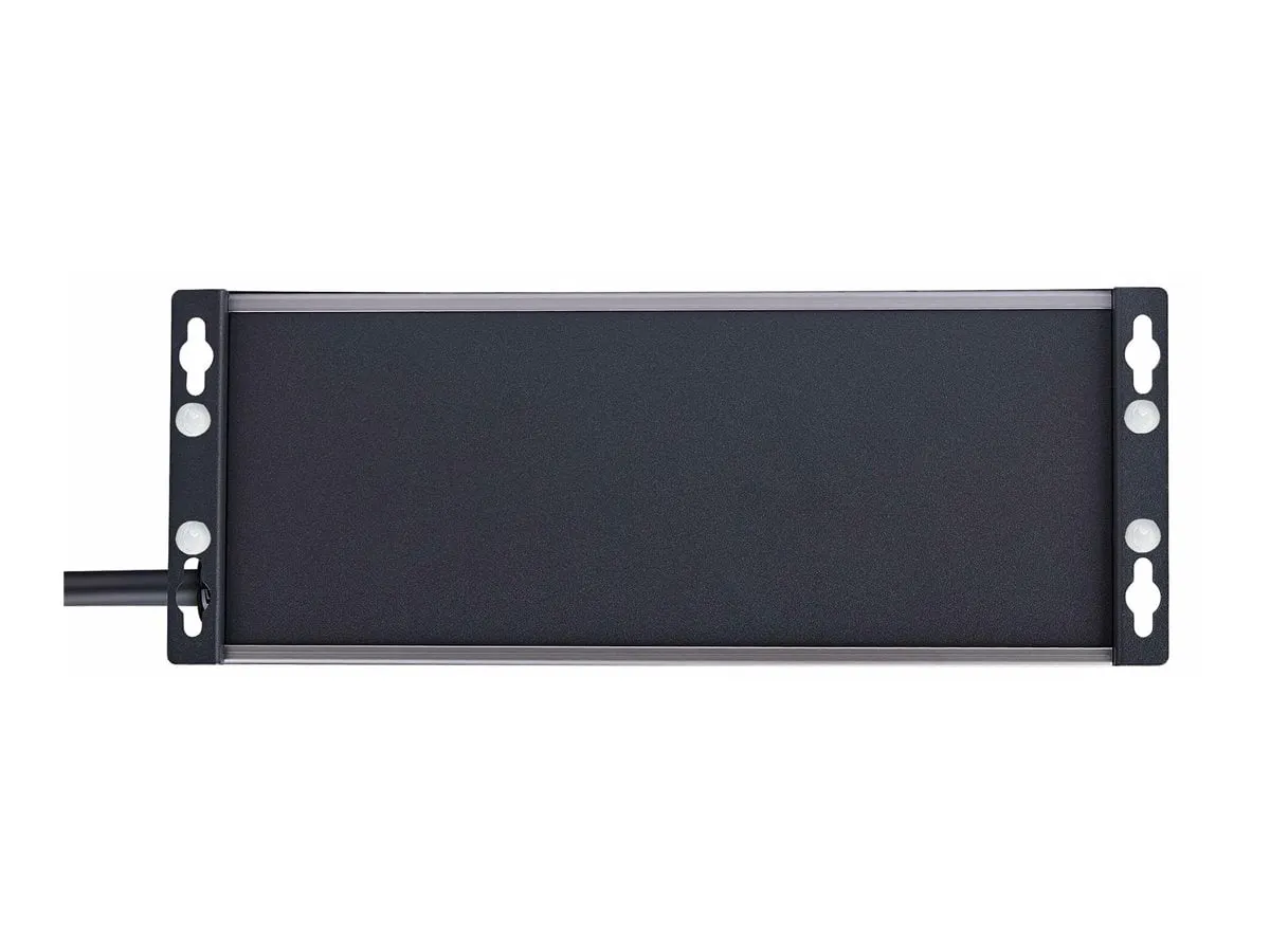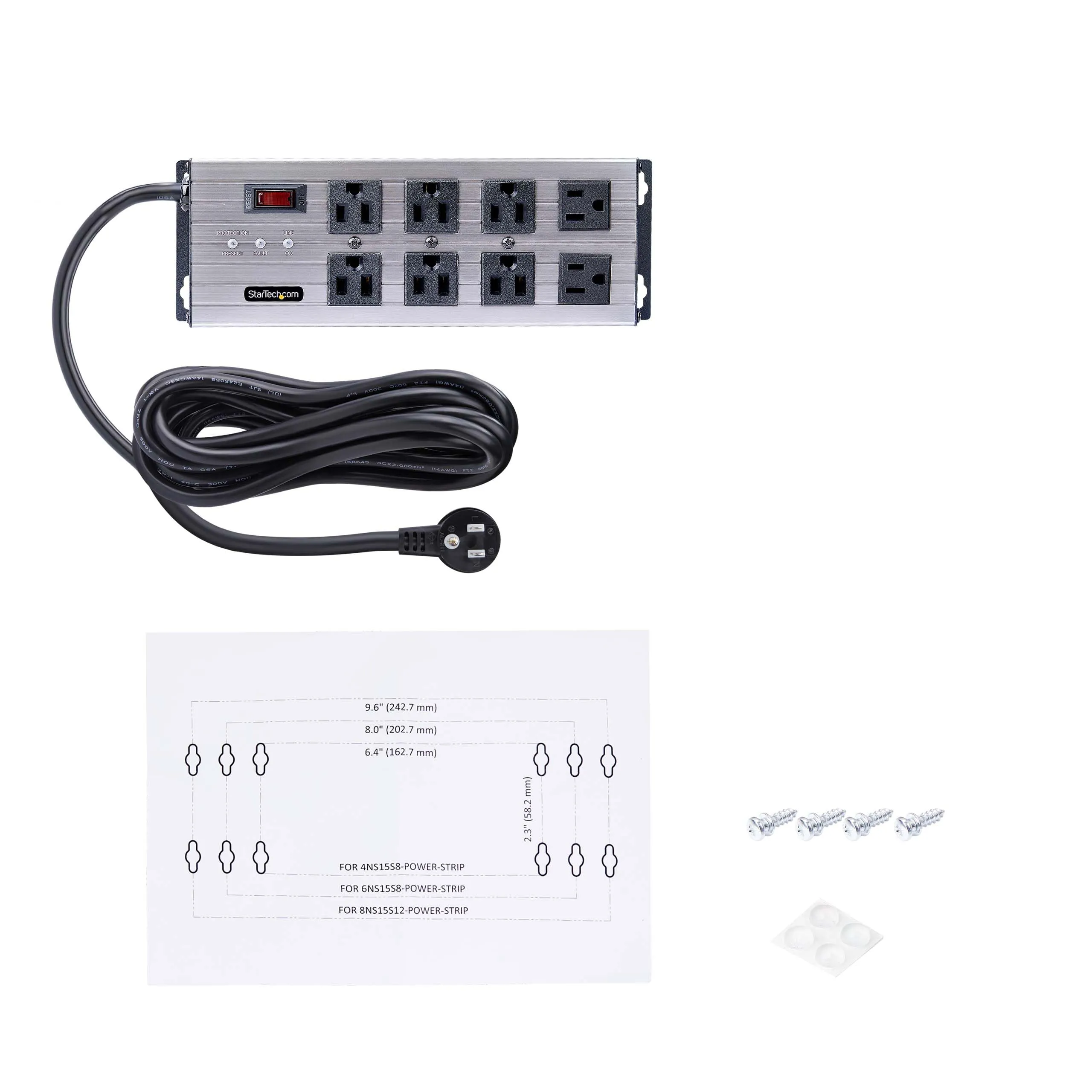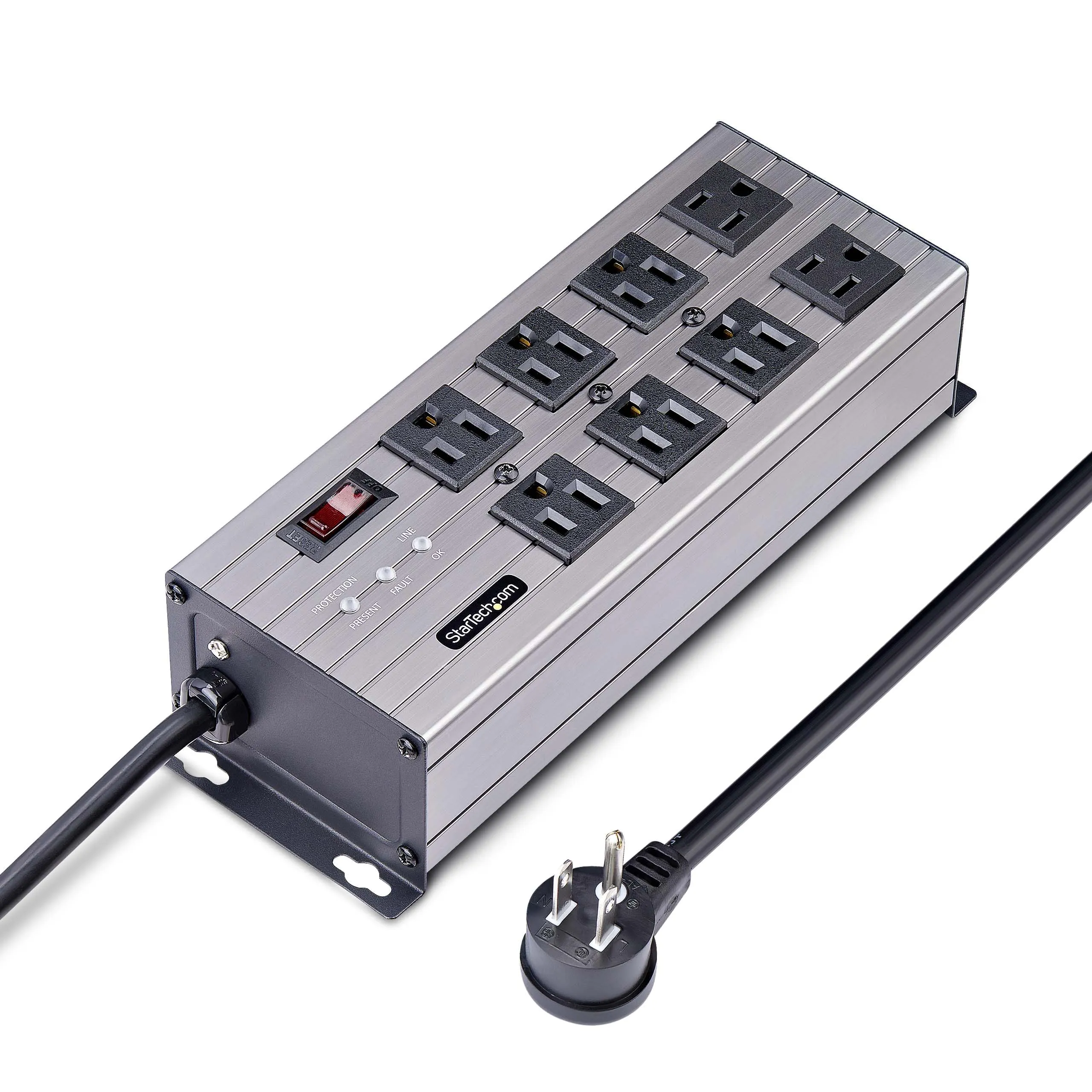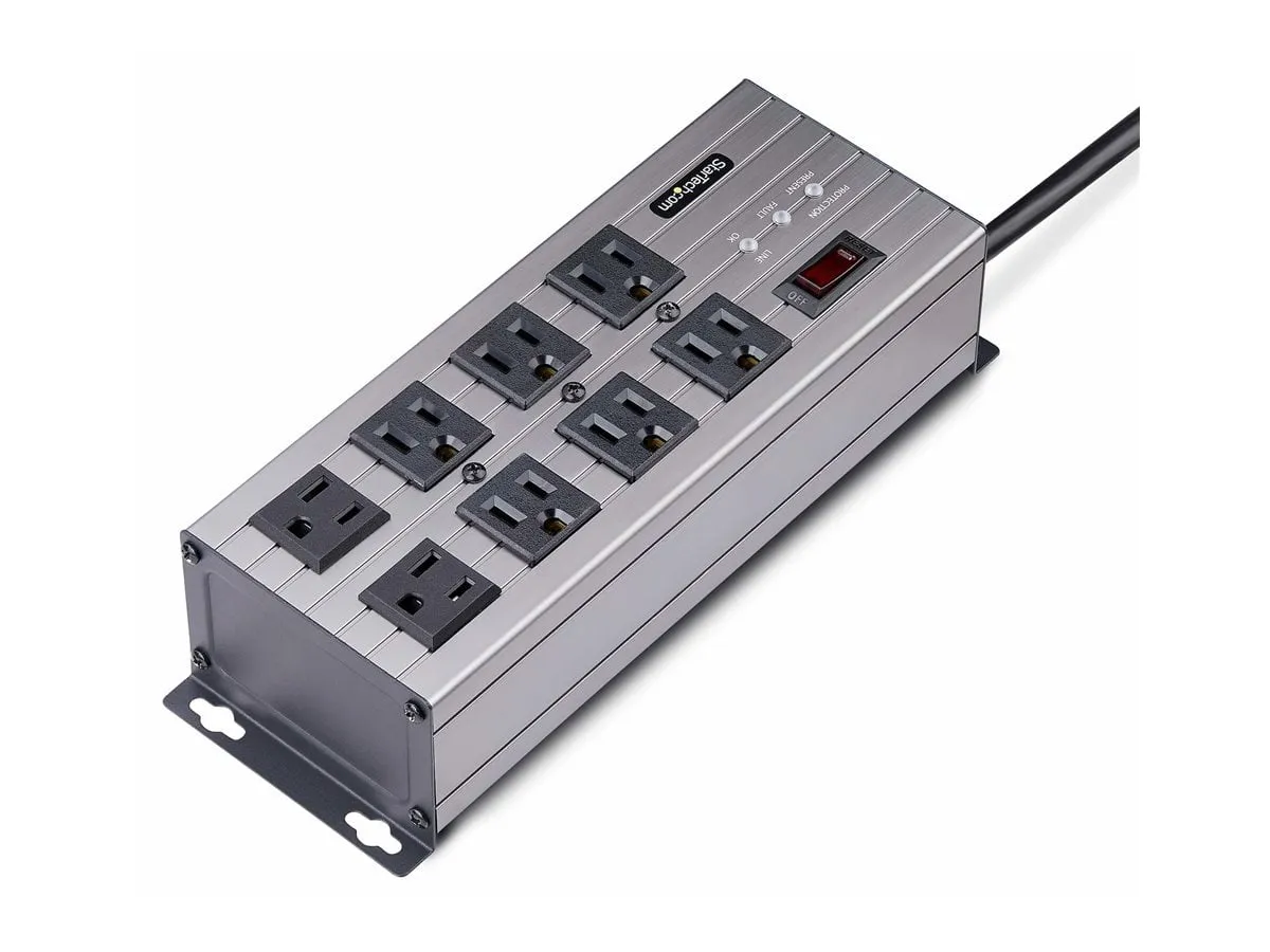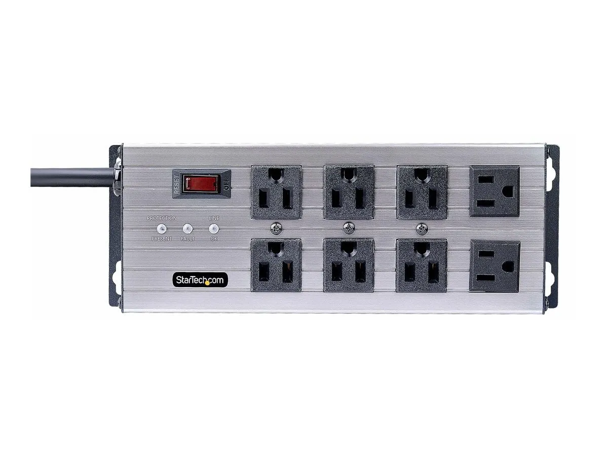 UL Listed 8-Outlet Industrial Grade Power Strip with 12ft NEMA 5-15P cord and 125V max. input/output - 8x widely spaced NEMA 5-15R outlets with EMI/RFI noise isolated filter banks (2-outlets per bank) - 15A circuit breaker and 3450-Joule surge protector ideal for network/server room - Built-in mounting ears with included mounting template and screws makes PDU temporary wall/surface mountable - Extruded aluminum housing and select outlets positioned at right-angles to ensure outlet access