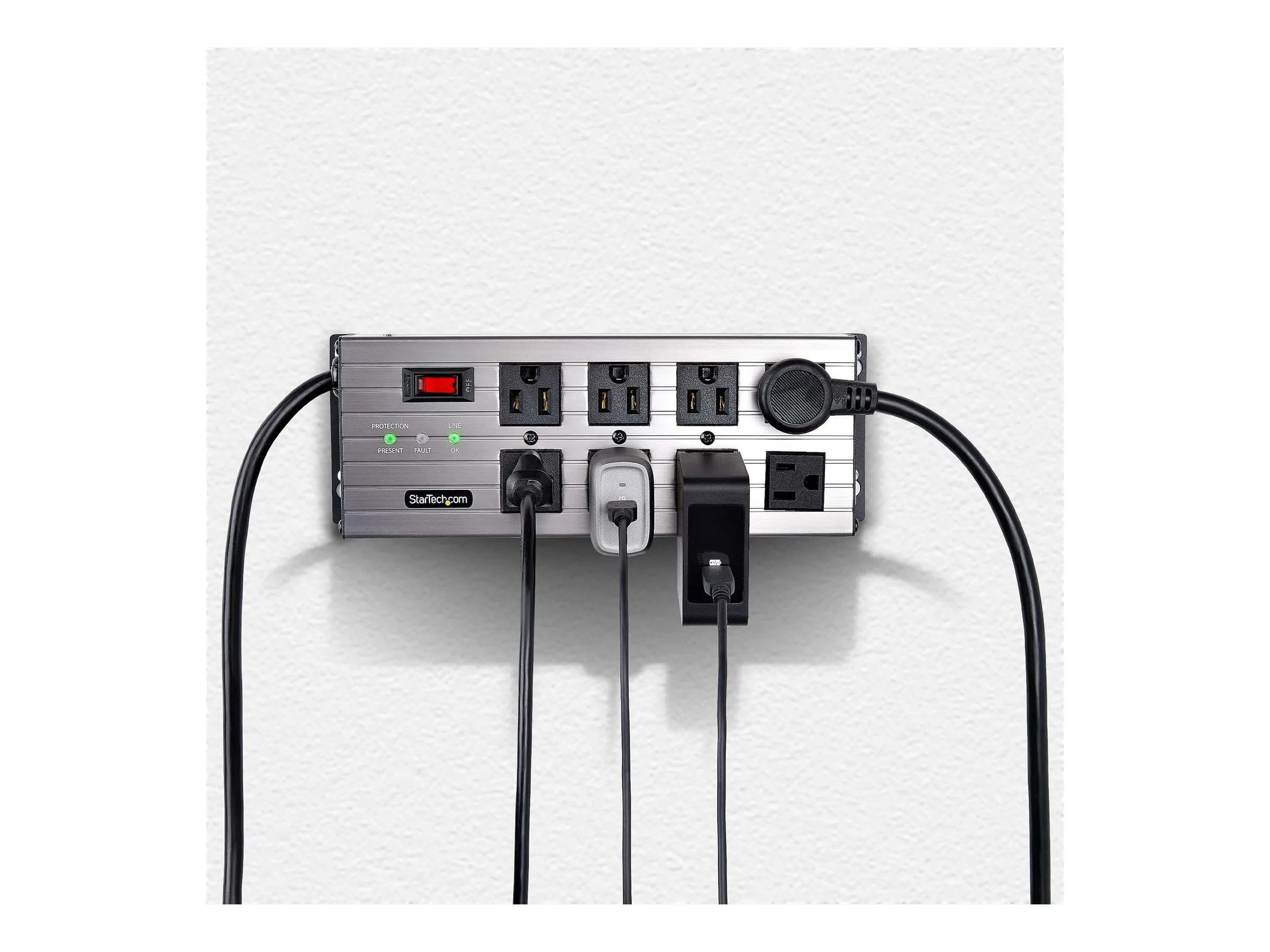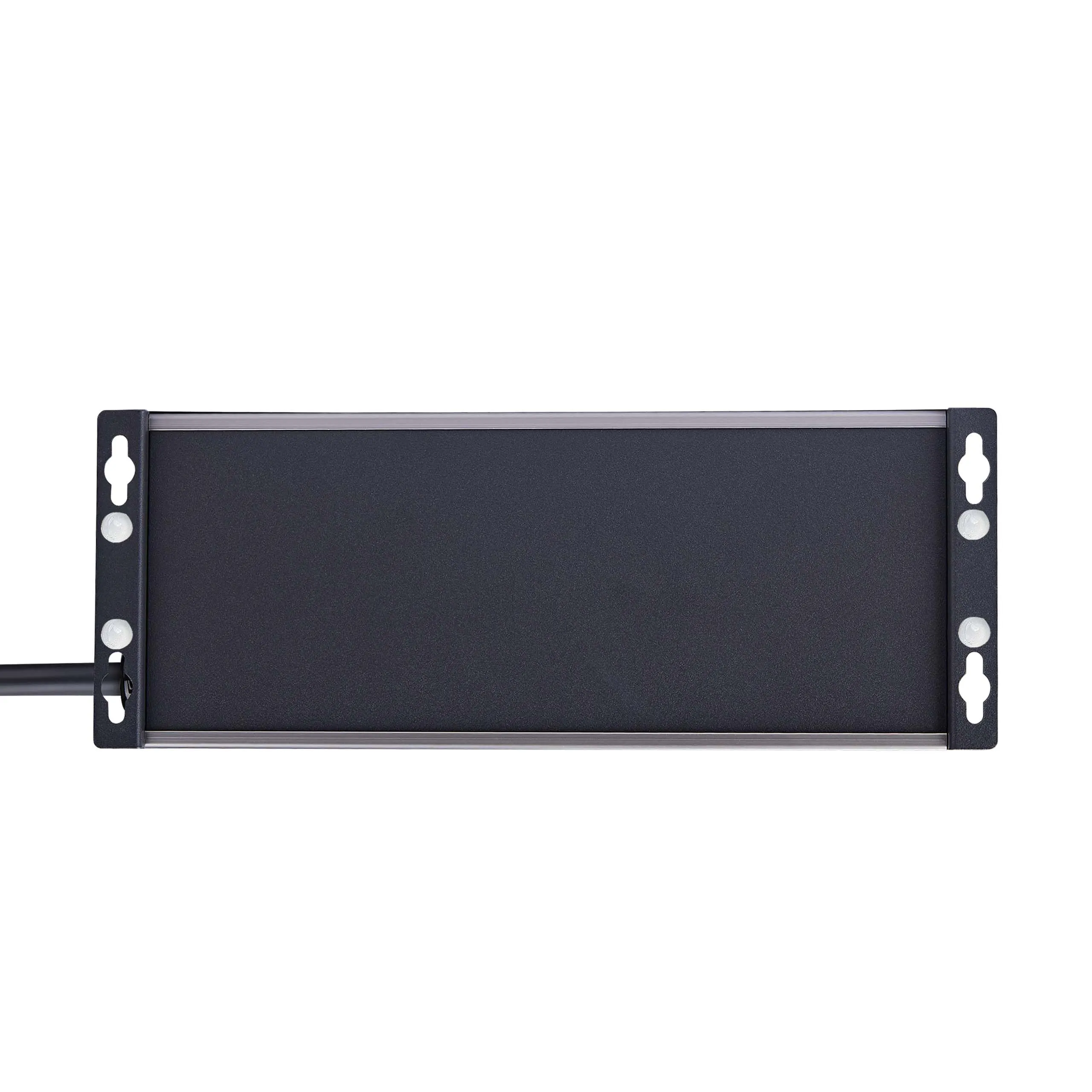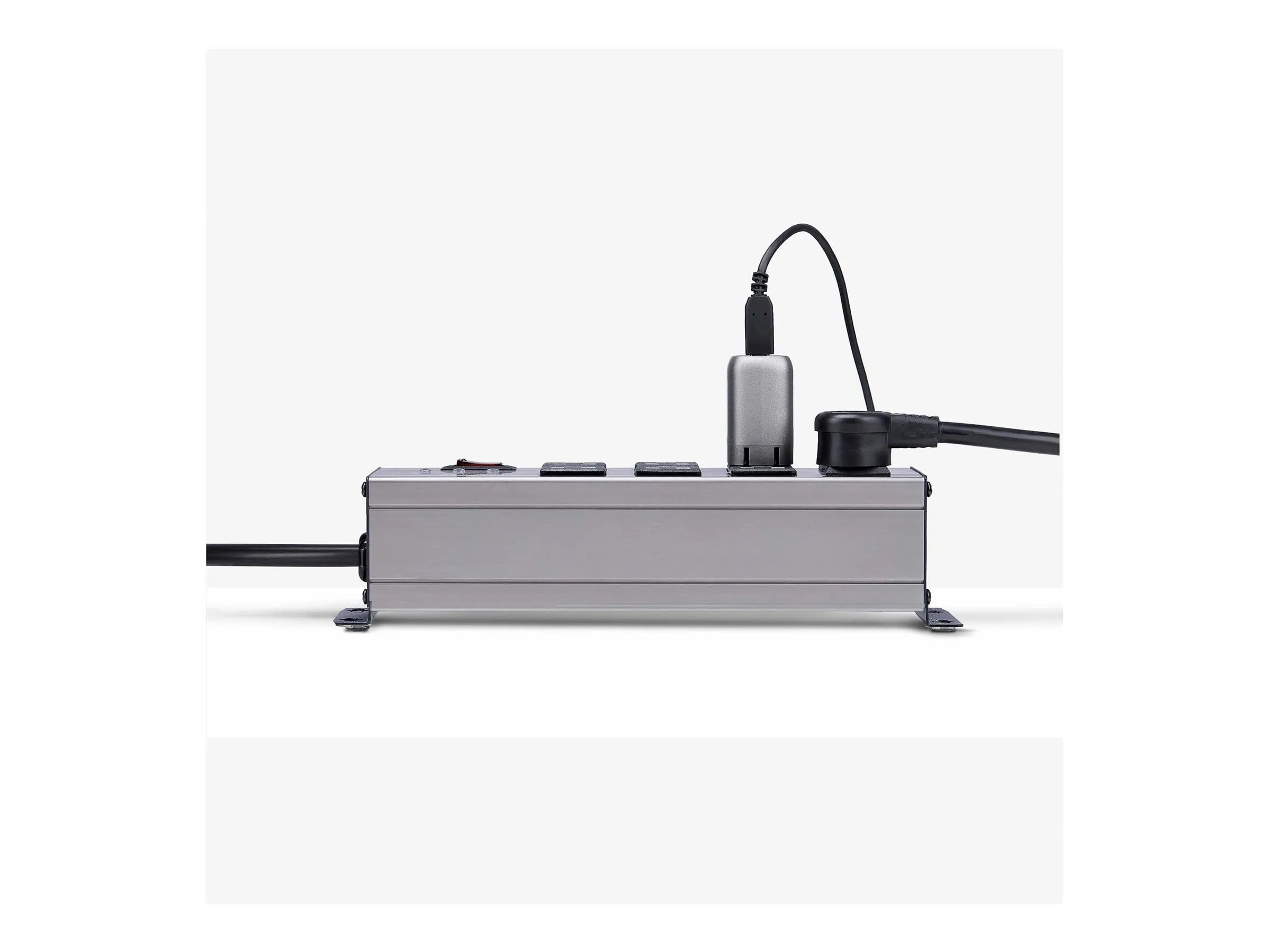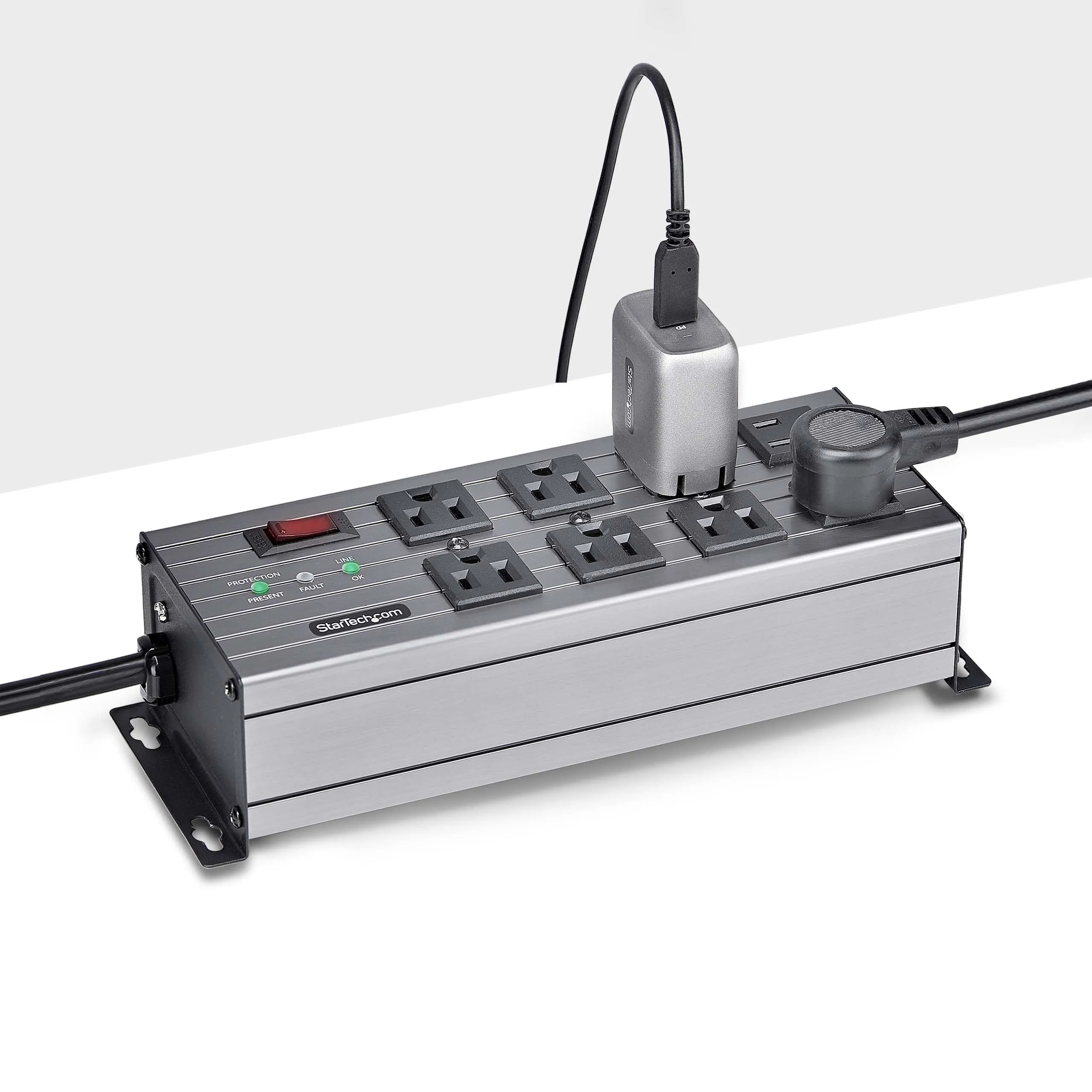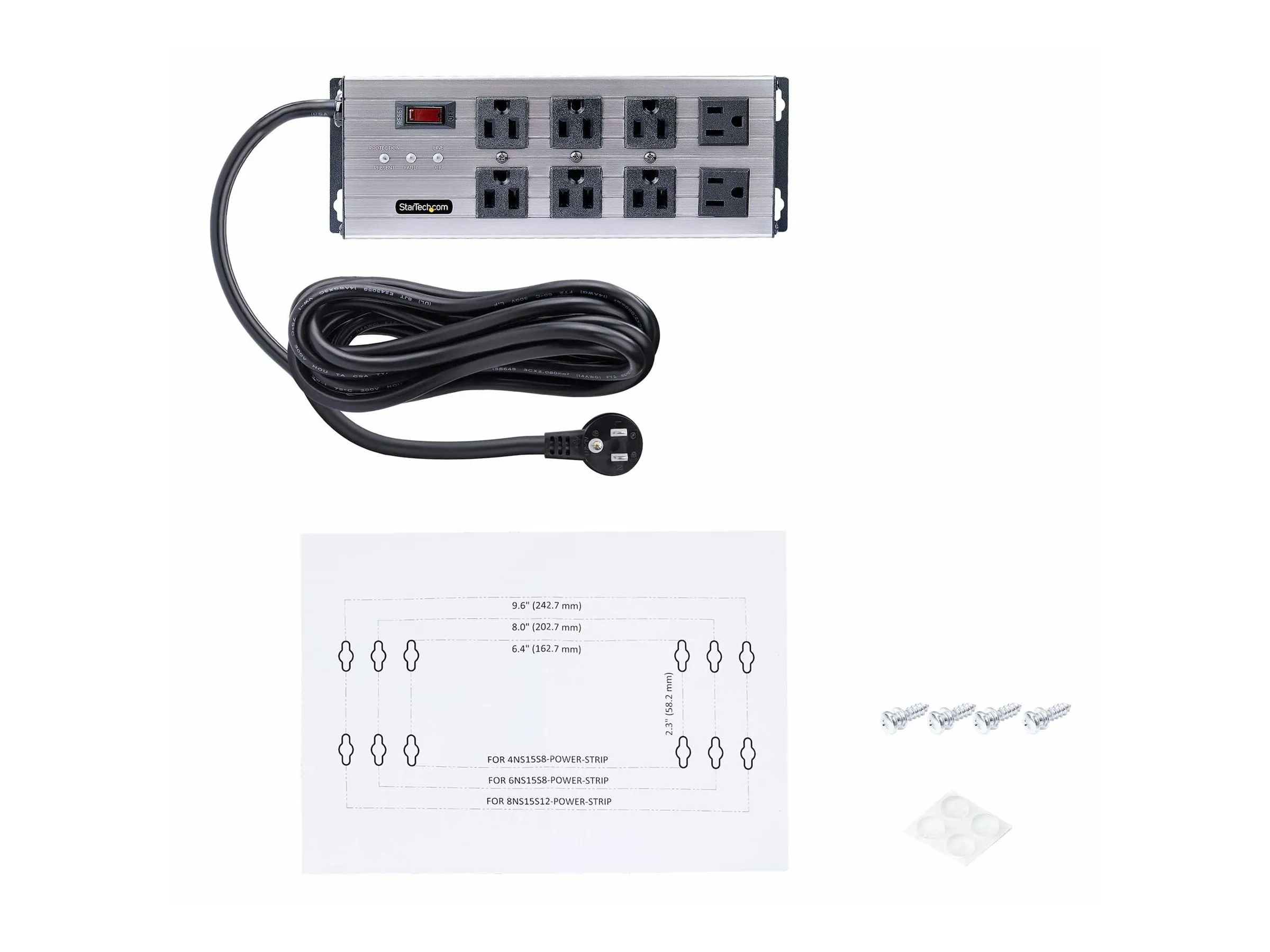 UL Listed 8-Outlet Industrial Grade Power Strip with 12ft NEMA 5-15P cord and 125V max. input/output - 8x widely spaced NEMA 5-15R outlets with EMI/RFI noise isolated filter banks (2-outlets per bank) - 15A circuit breaker and 3450-Joule surge protector ideal for network/server room - Built-in mounting ears with included mounting template and screws makes PDU temporary wall/surface mountable - Extruded aluminum housing and select outlets positioned at right-angles to ensure outlet access