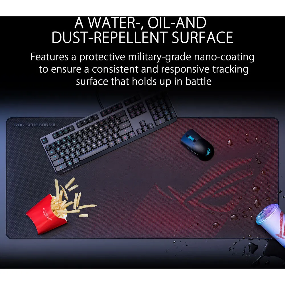 The ASUS ROG Scabbard II Extended Gaming Mouse Pad is designed for serious gamers seeking a perfect staging area for their gaming gear. With a durable fabric surface and military-grade nano-coating, it repels water, oil, and dust, ensuring an optimal gliding experience for your mouse.