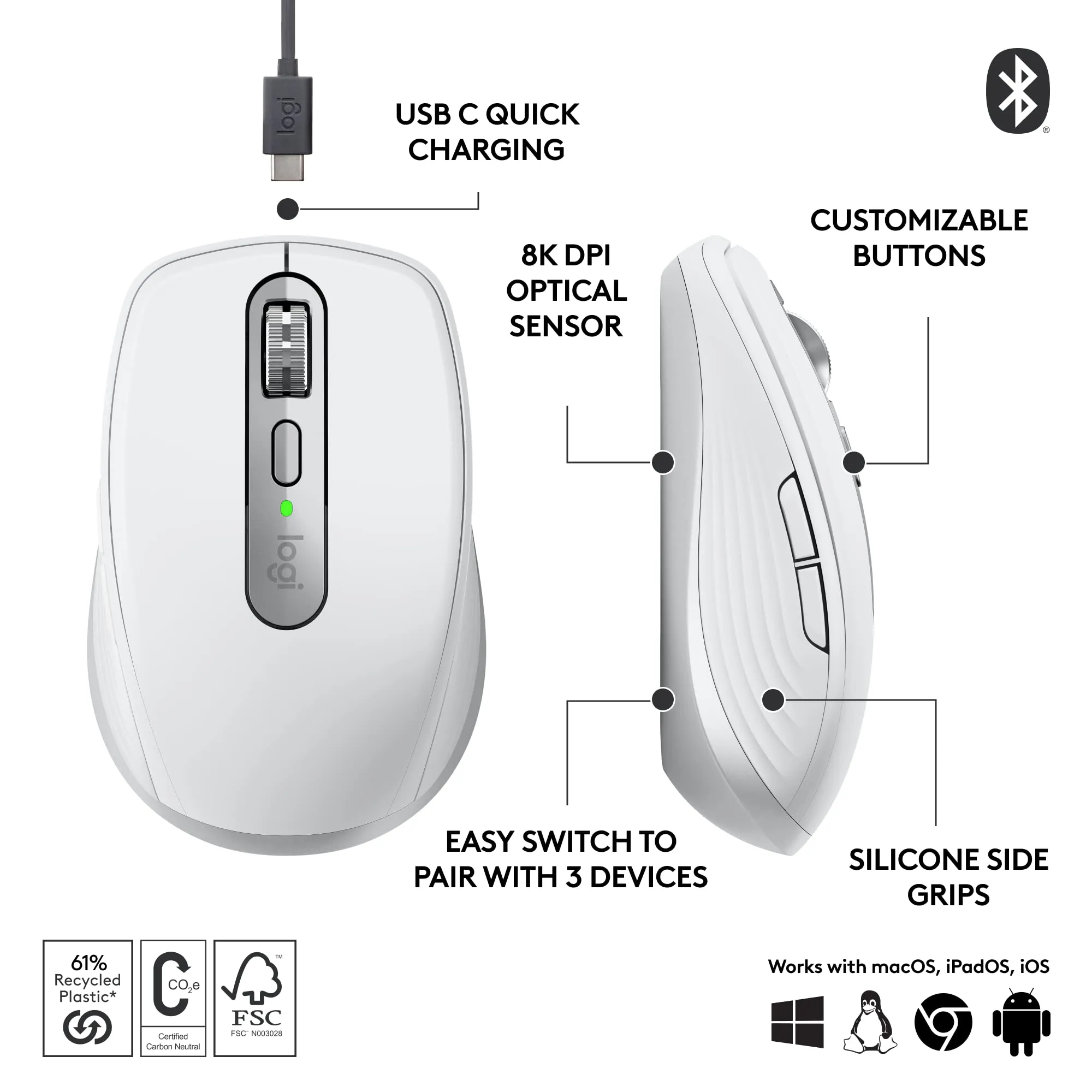 The Logitech MX Anywhere Mouse 3s in Pale Grey combines comfort and performance in a compact design. It features advanced technology that allows for smooth tracking on various surfaces, making it perfect for both home and office use.