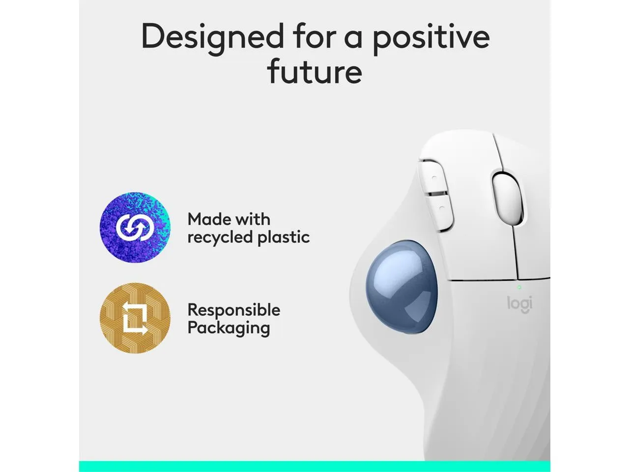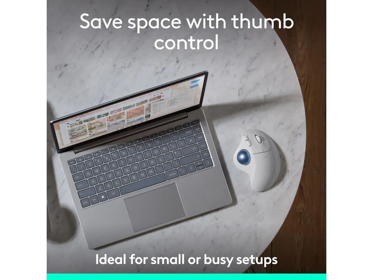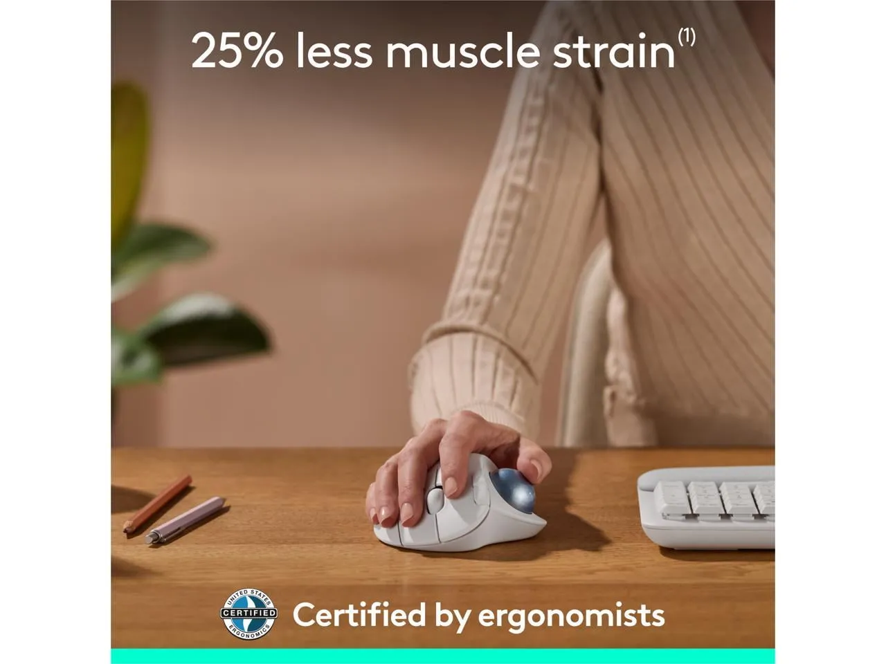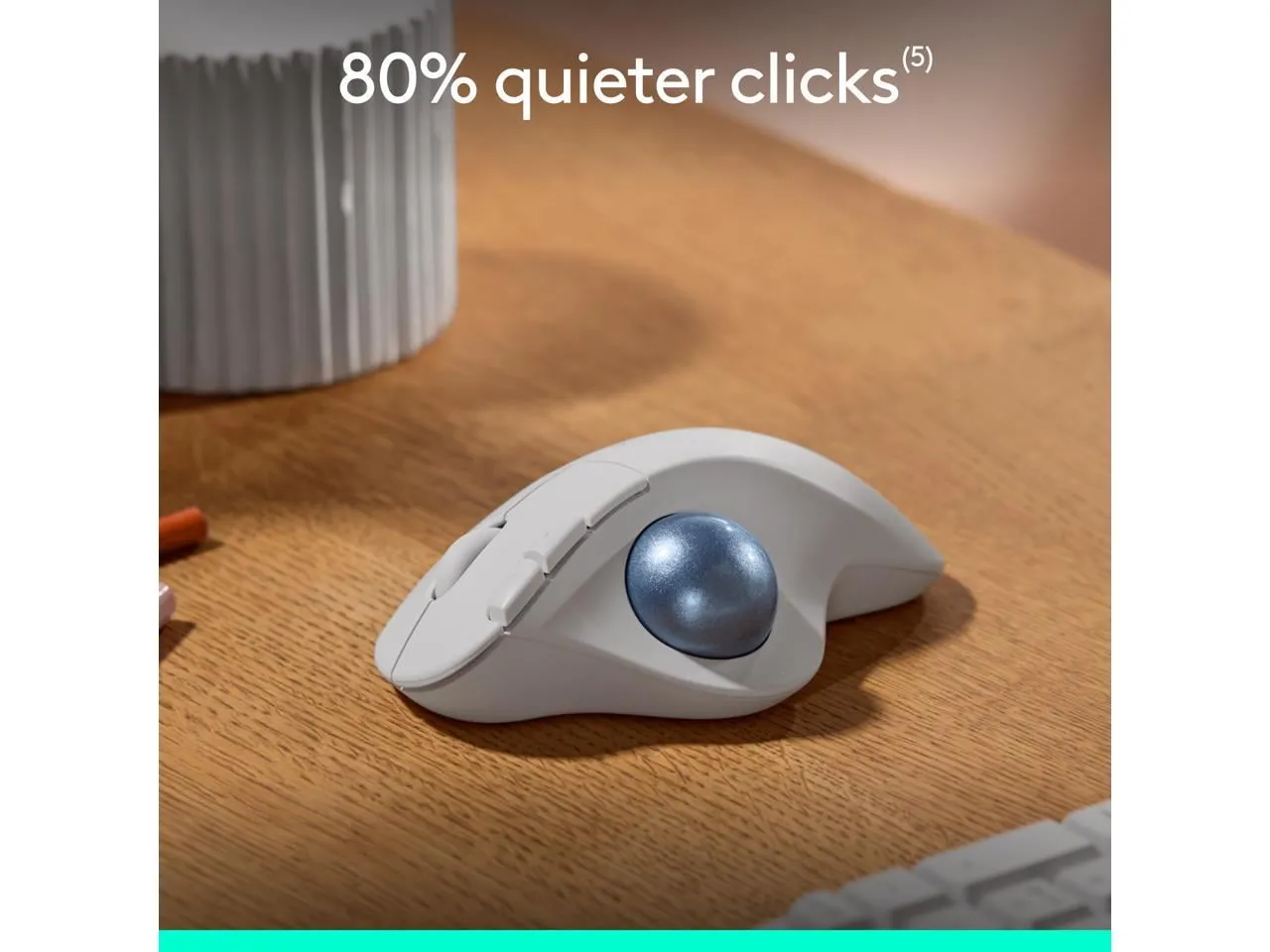 The Logitech M575s Wireless Ergonomic Trackball Mouse combines comfort and convenience, designed for extended use without the strain. With its sleek off-white design and a smooth blue trackball, it offers precise control and an effortless navigation experience.