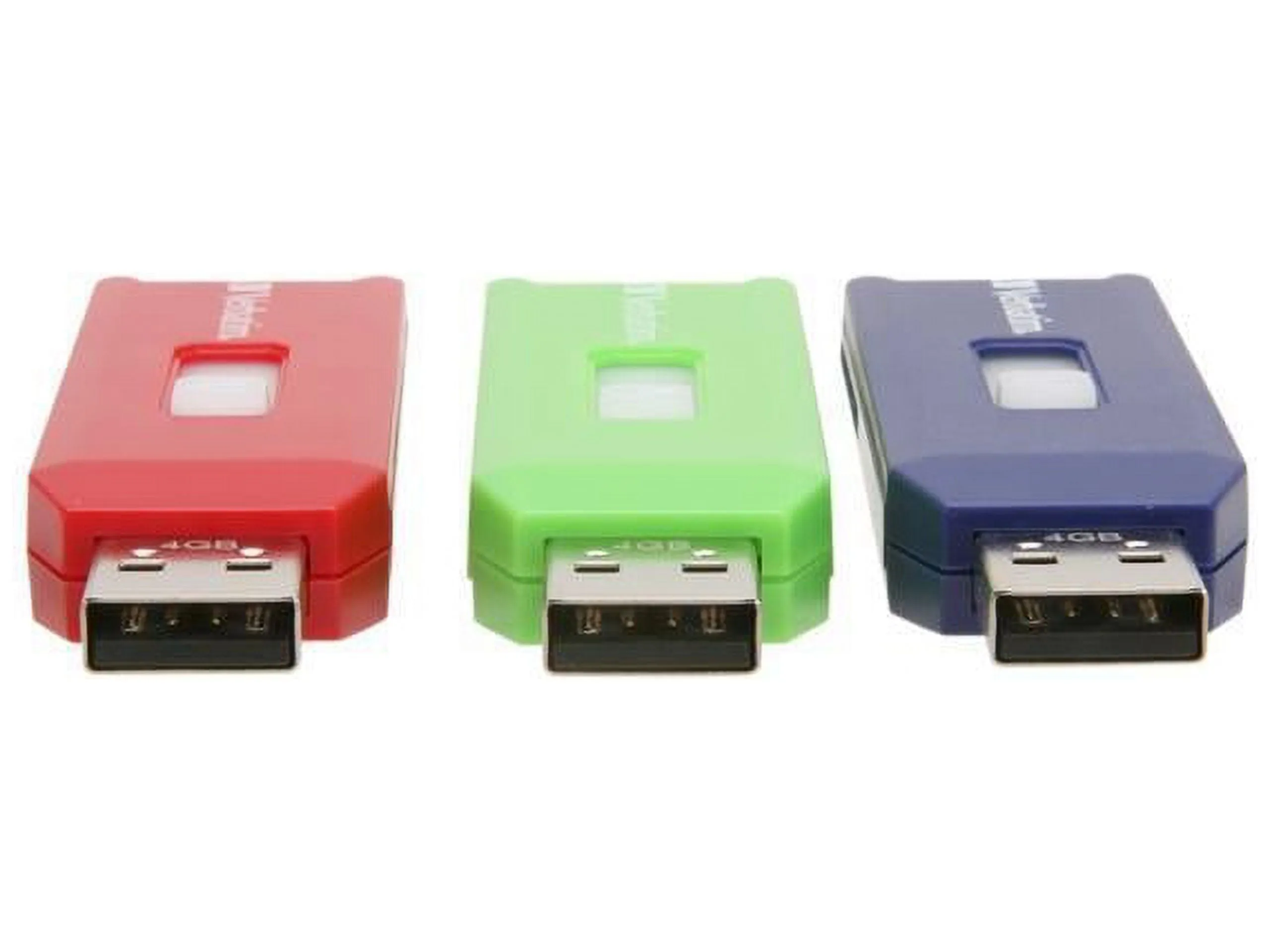 • 4GB;• Makes transporting & sharing files simple & convenient;• Retractable USB connector means no cap to lose;• Password security feature;• Limited lifetime warranty;• Works with Windows(R) only;• Red, Green & Blue;• 3 pk;